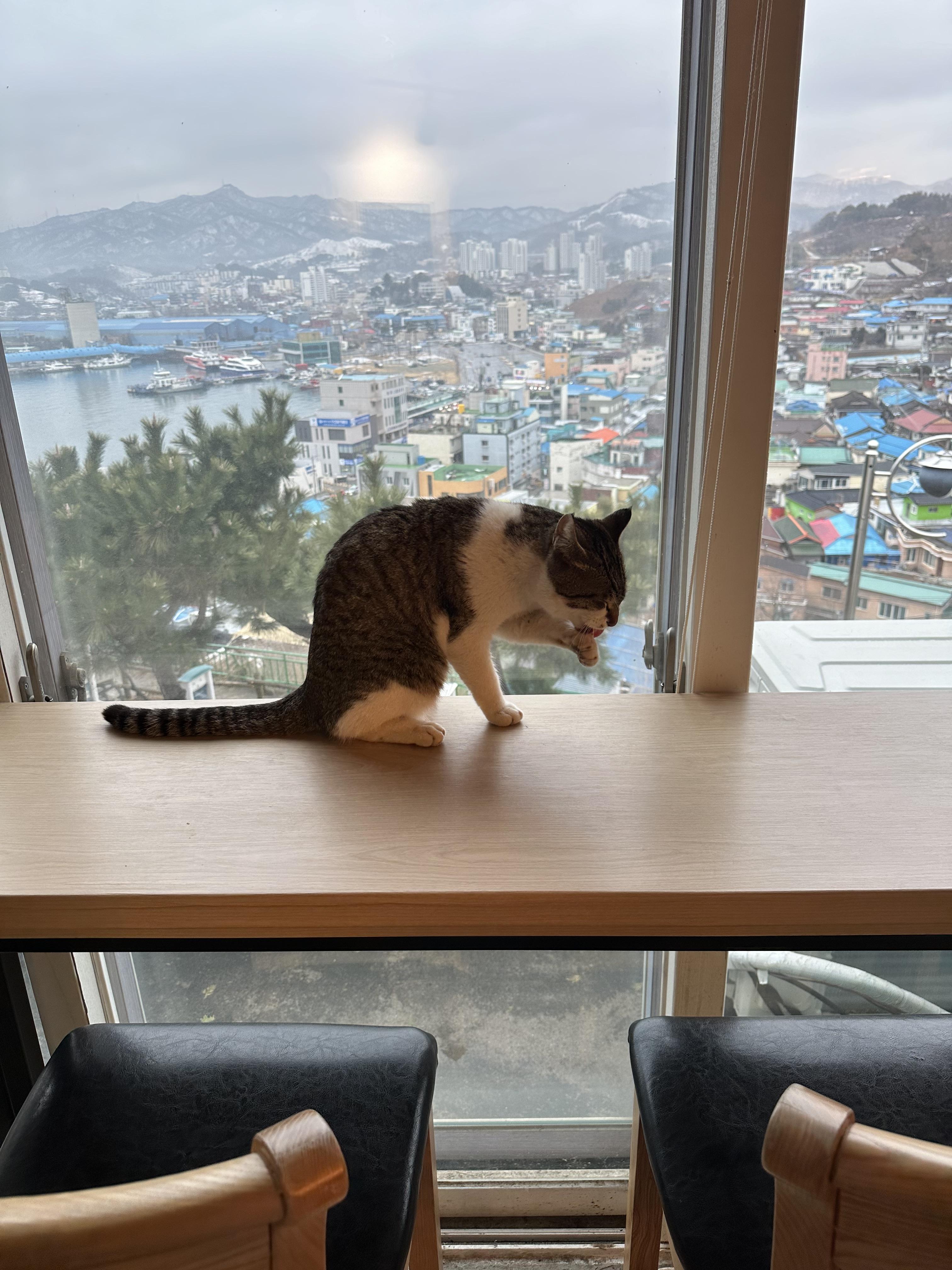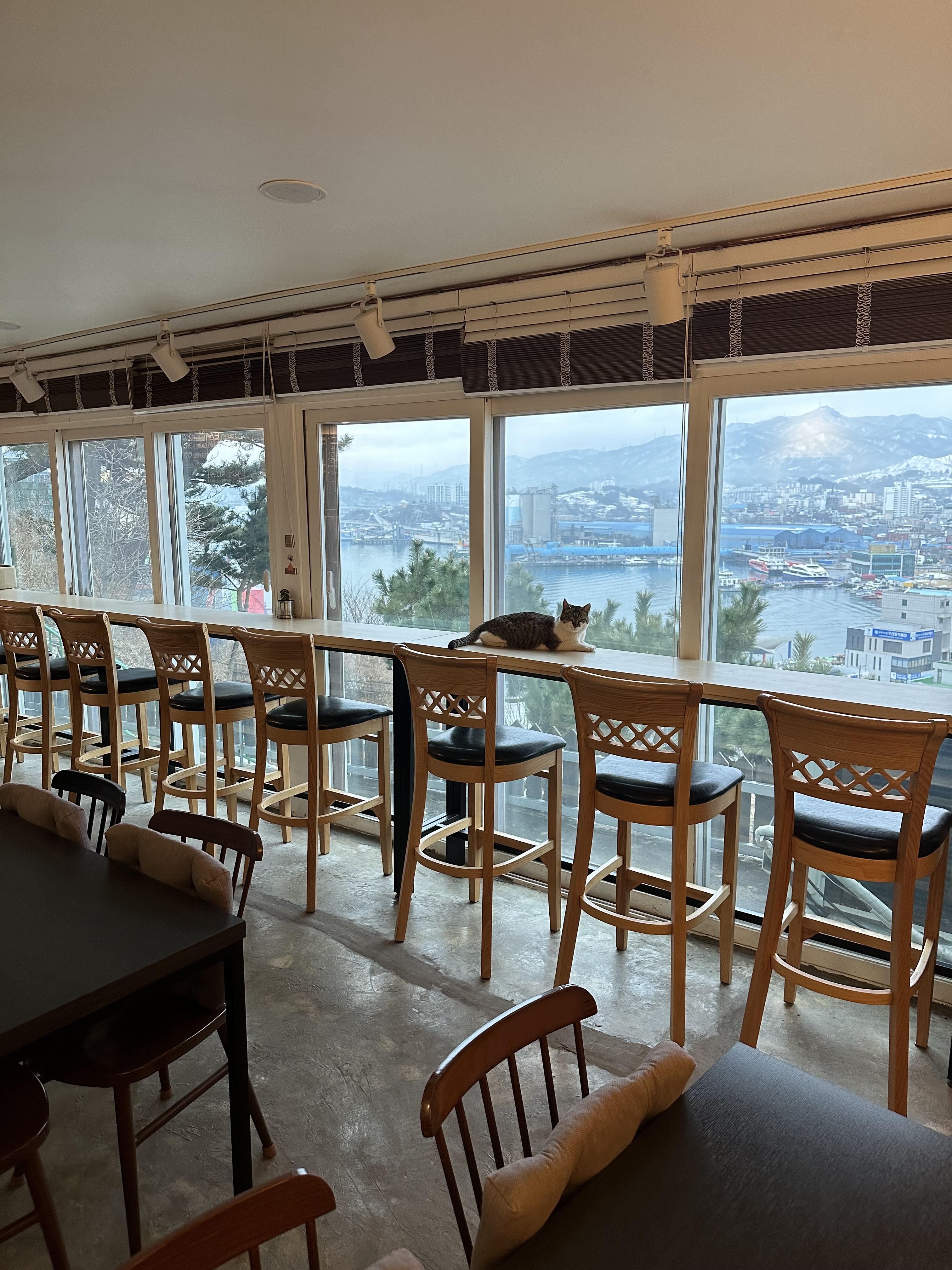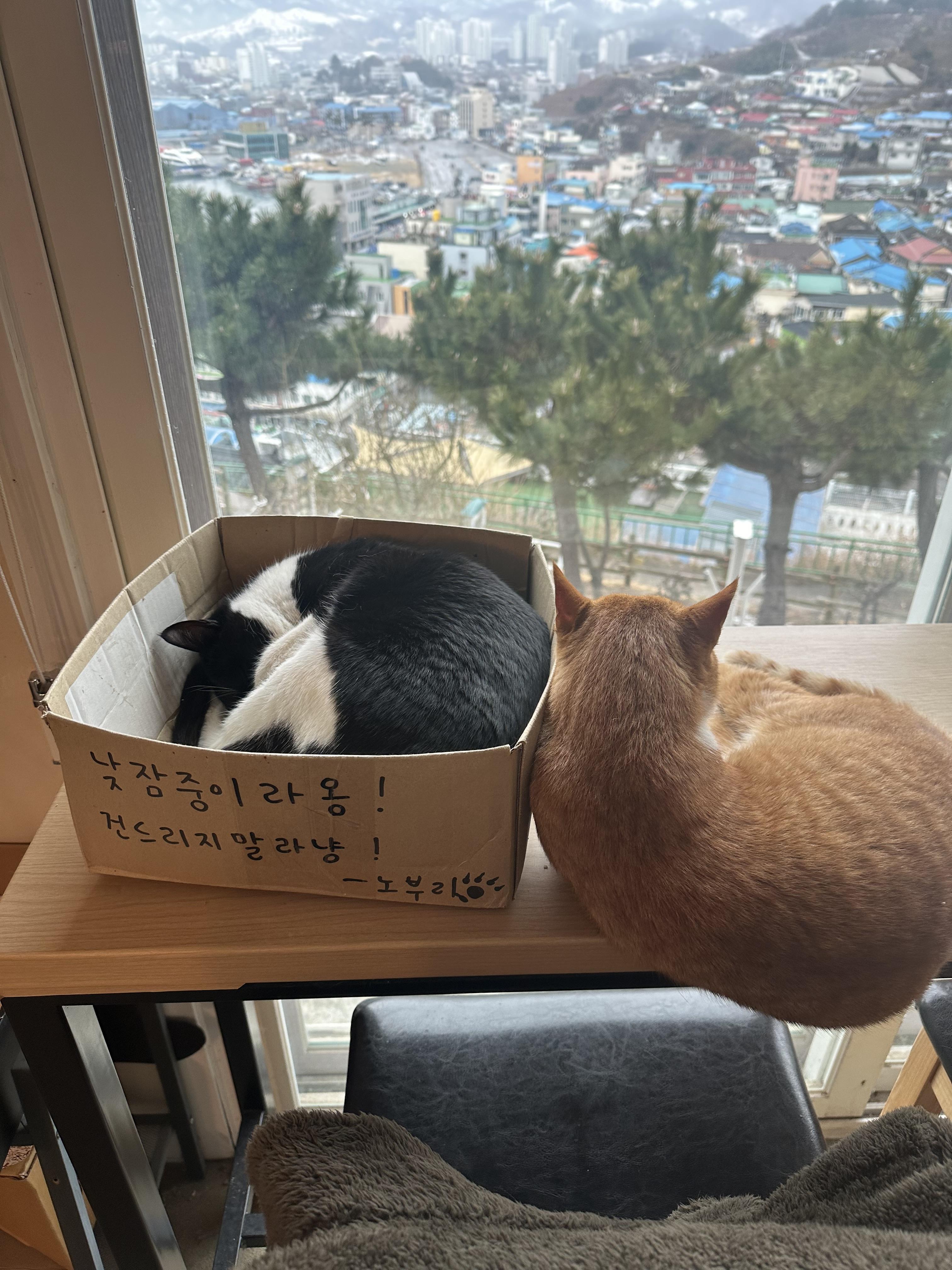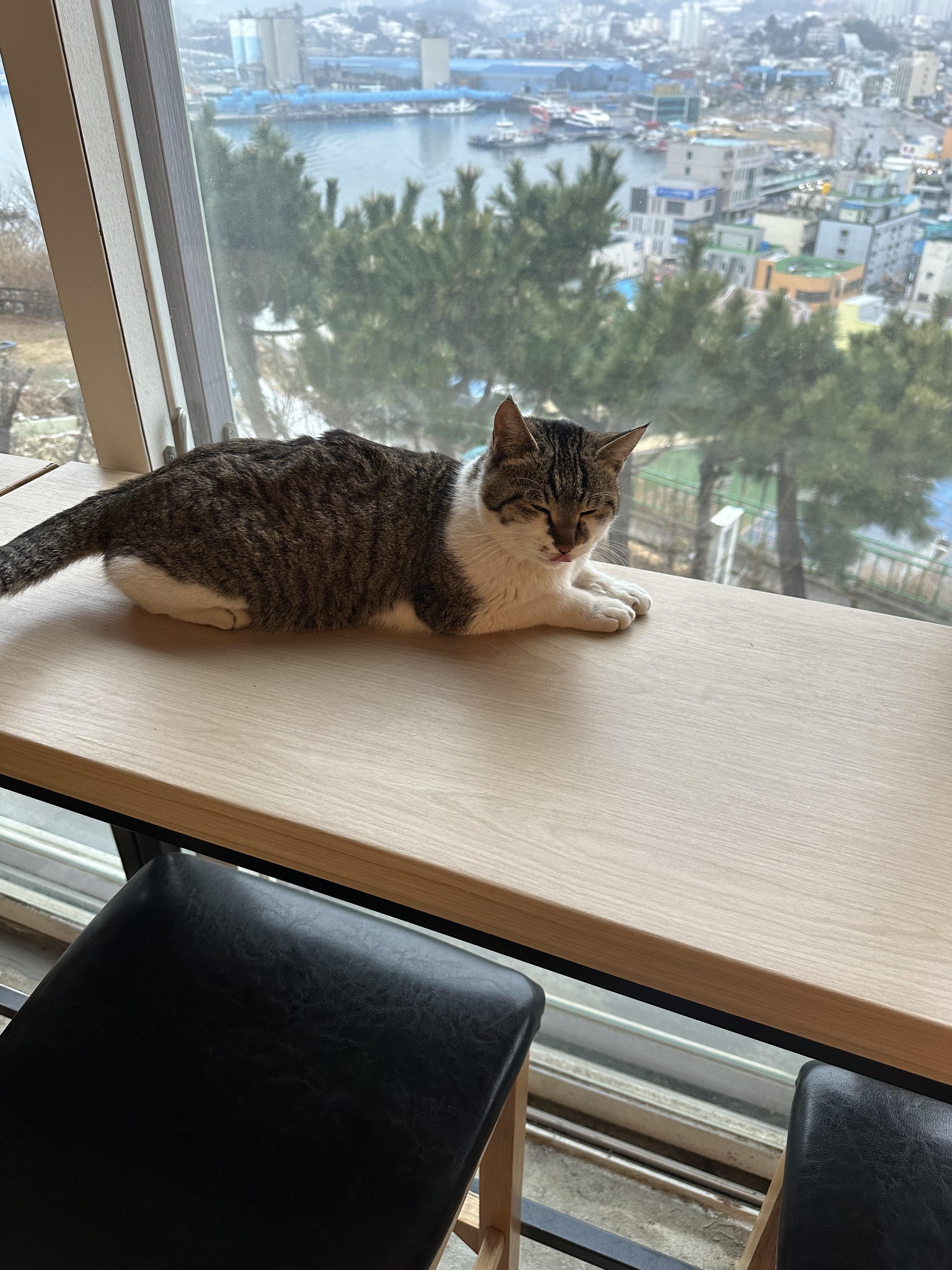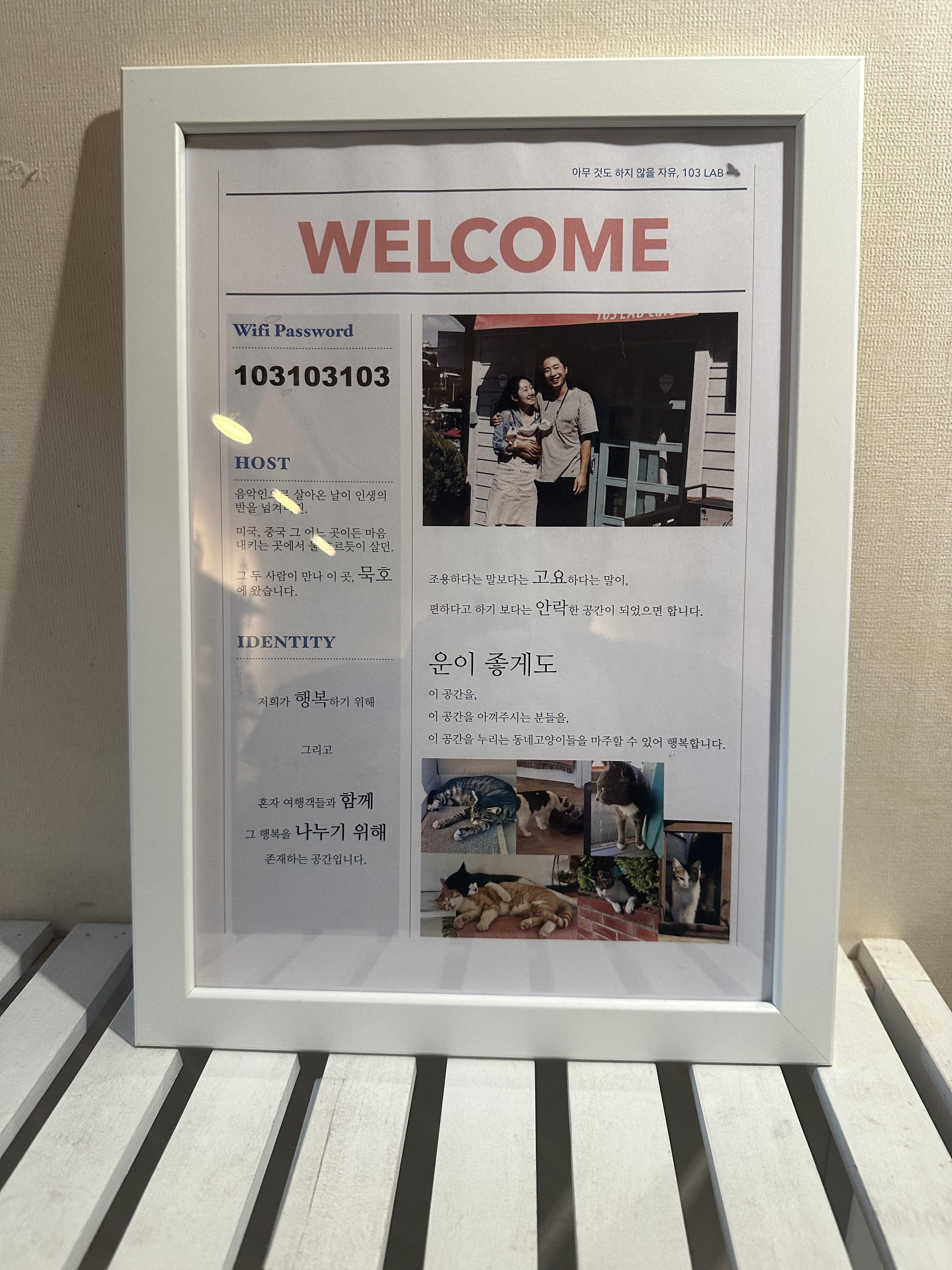 처음 2018년에 방문했을 때 어느 젊은 부부가 운영하는 103LAB게스트하우스였습니다. 그리고 2019년에 방문했을 때는 중년 사장님 부부로 바뀌었습니다. 그리고 이번에 방문했을 때 사장님이 바뀌었는데 제가 처음방문했을 때 그사장님은 아닌거같구 2019년 이후 2020년에 지금의 사장님 부부로 바뀐 이후로 쭉 운영하고 계시나고 합니다. 미국과 중국을 돌아다니며 음악을 했던 부부 사장님이 묵호에 정착 후 지금까지 103LAB 게스트하우스를 운영하고 있는 것 같습니다. 묵호에도 길고양이들이 많이 있습니다. 밤이라서 그런지 고양이들은 안보엿습니다. 아침이 되니까 사장님 부부가 출근하면서 고양이들도 카페에 있는 모습을 볼 수 있었습니다. 일부 고양이는 직접 키우시는 것 같았습니다.