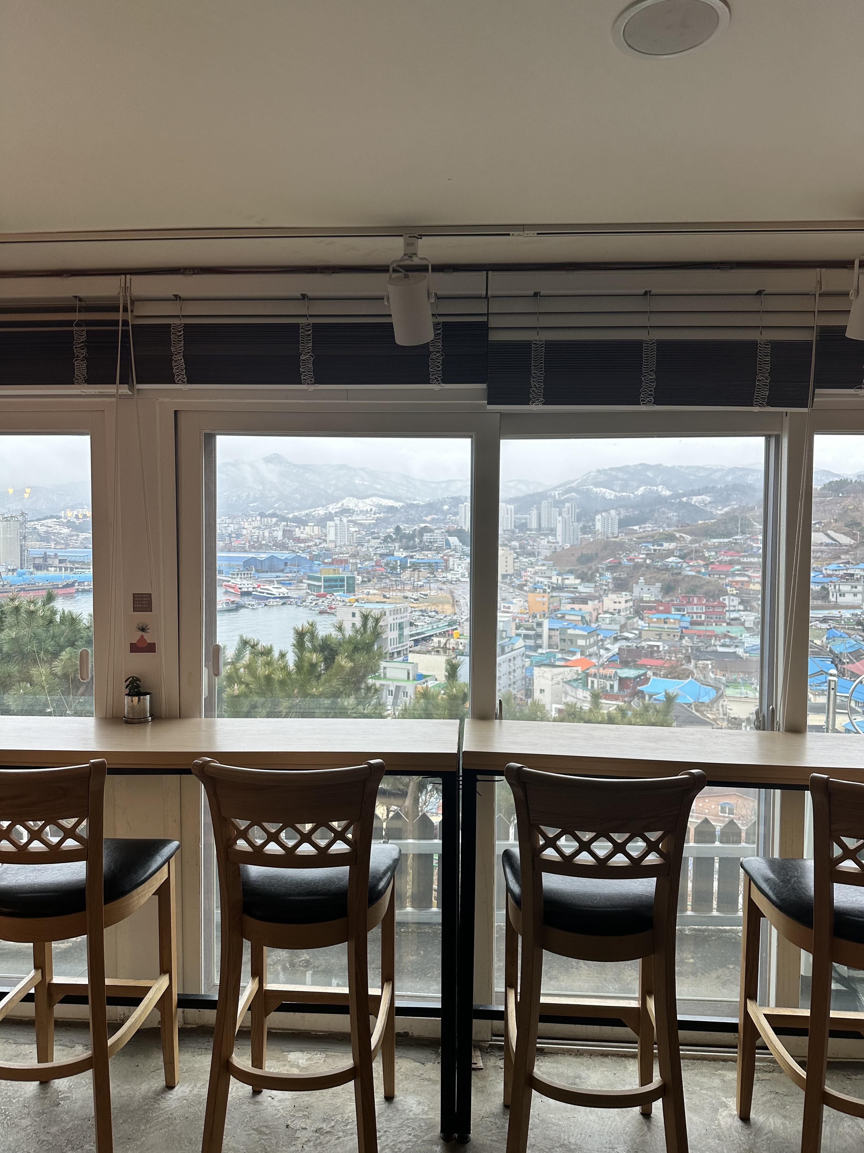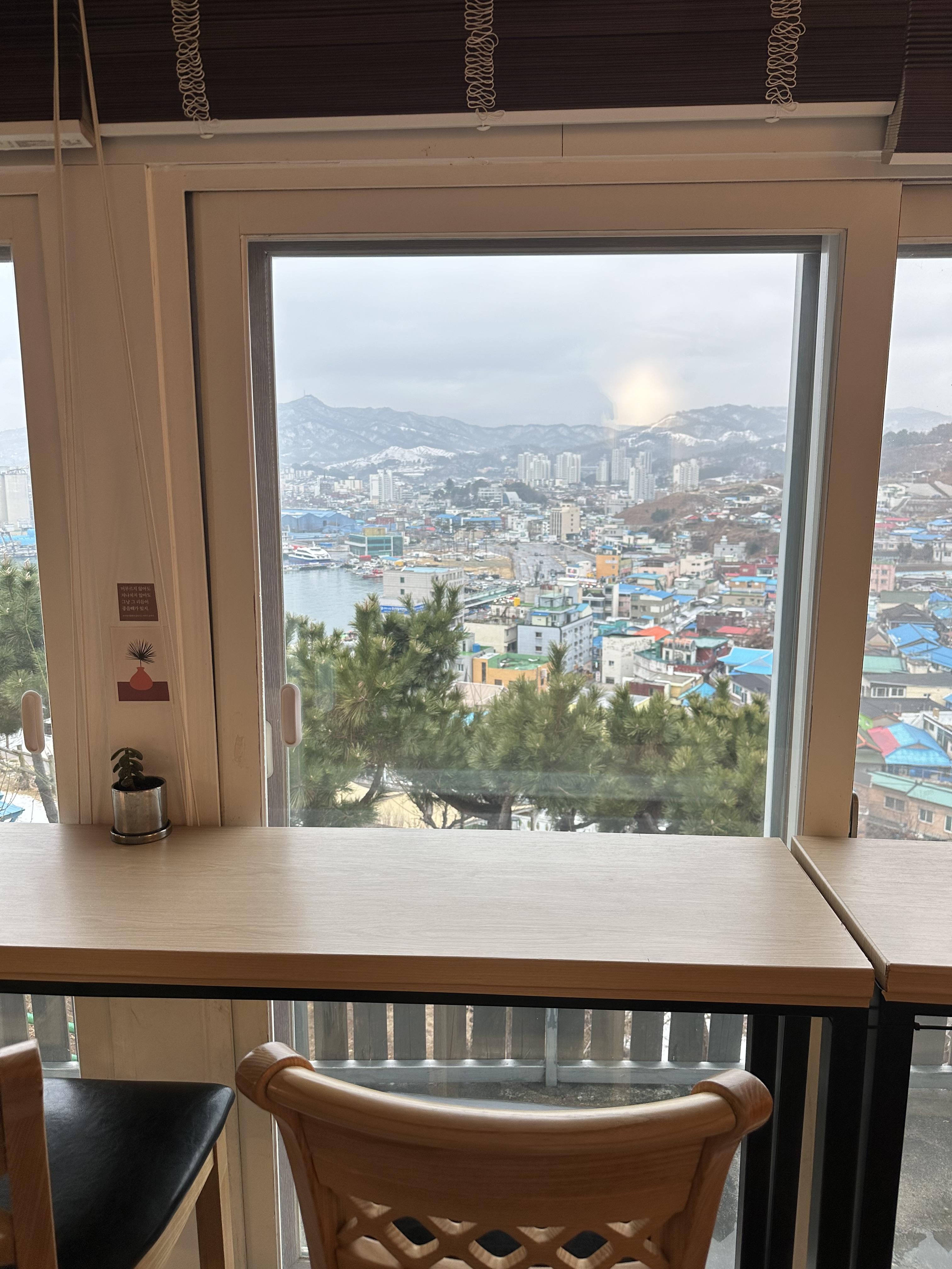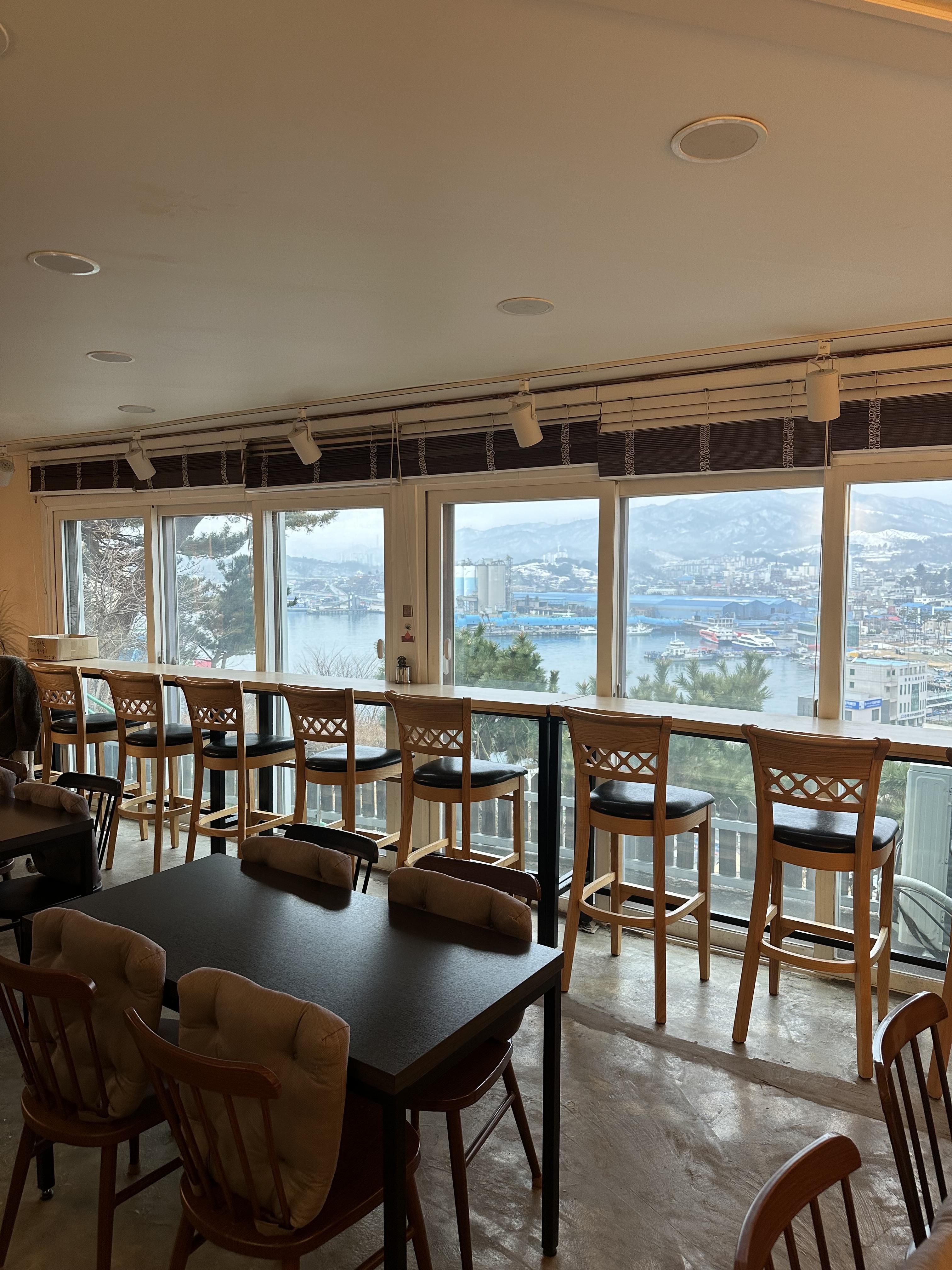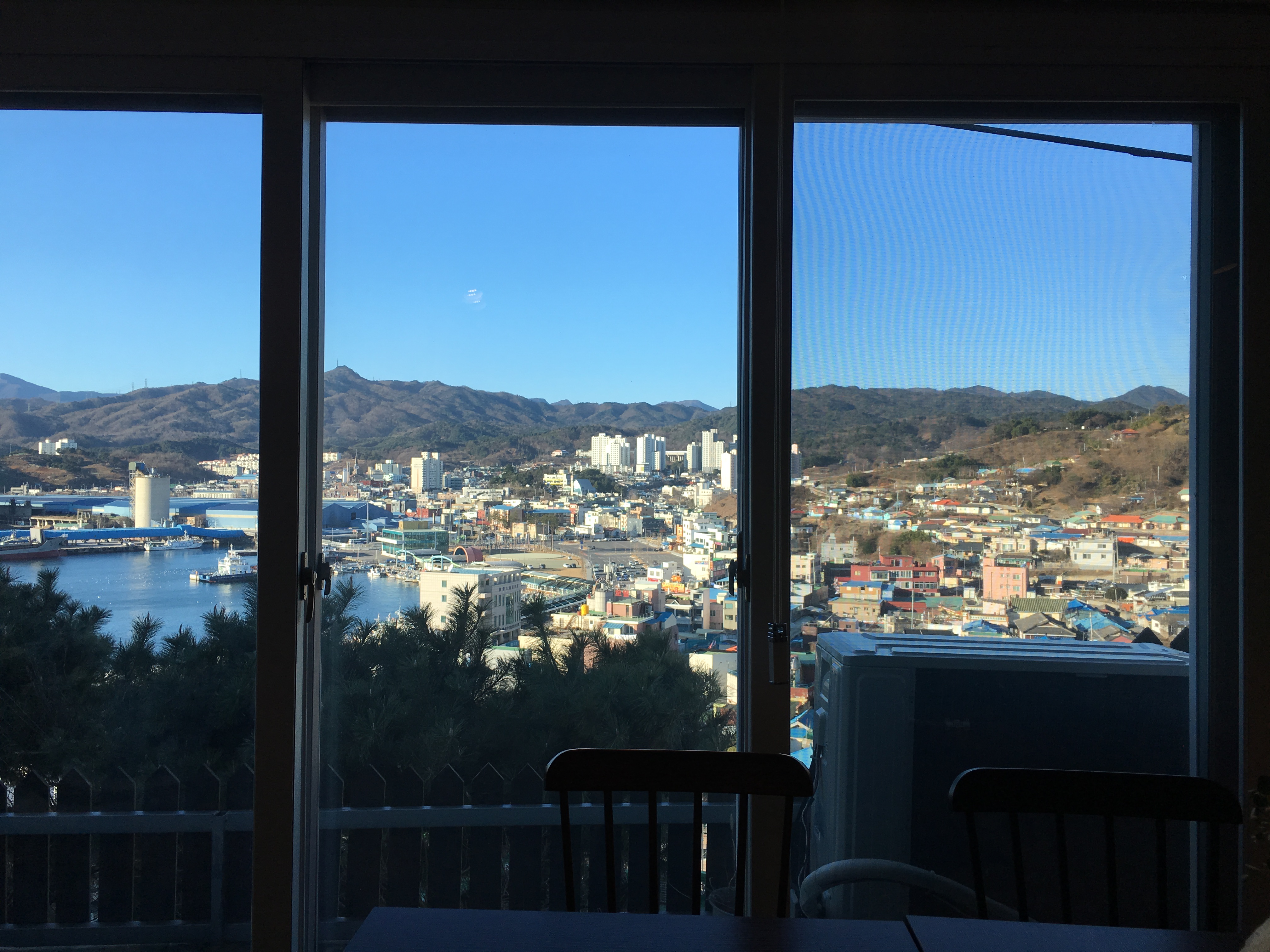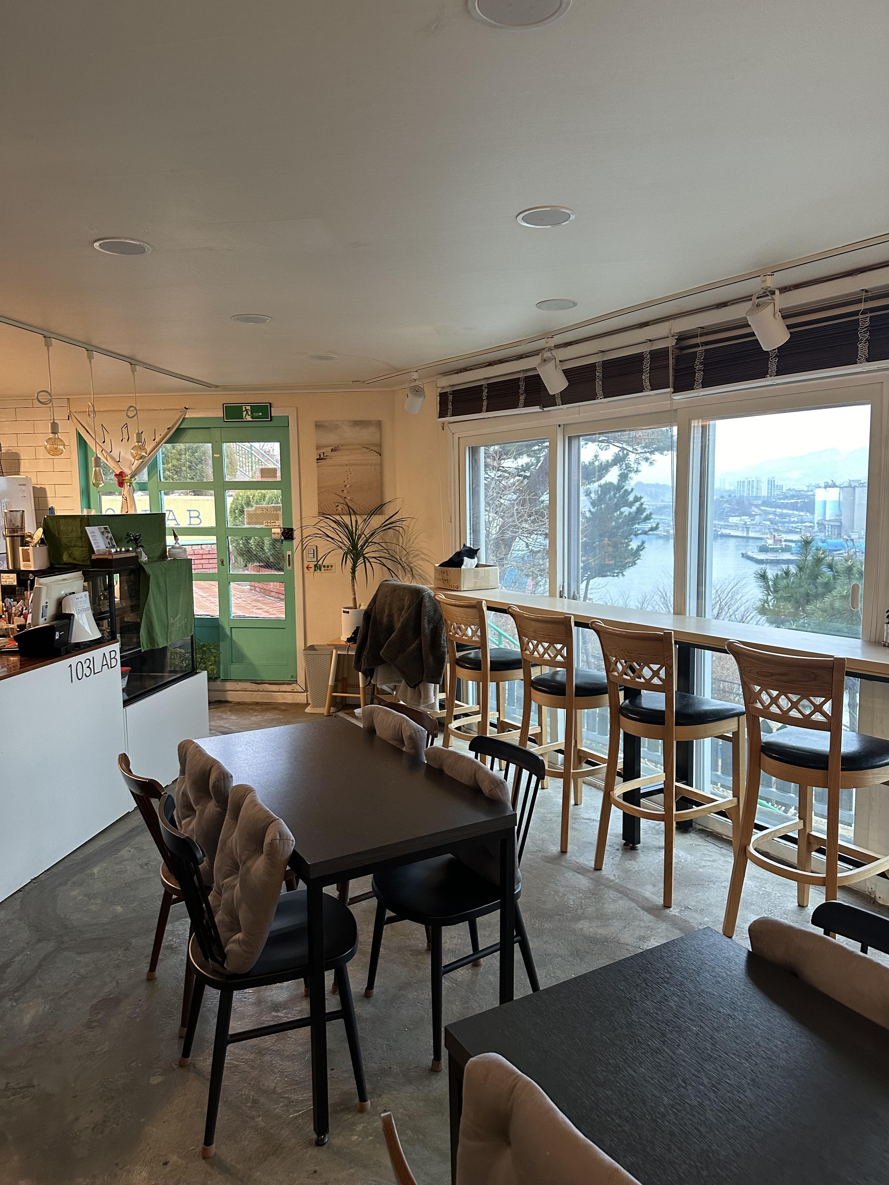 아침이 밝았습니다. 도미토리룸에서 일어나서 103LAB의 카페이면서 공용공간으로 나갔습니다. 밤에는 어두워서 잘보이지 않았지만 이렇게 103LAB게스트하우스를 찾는 이유는 높은 언덕 위에서 동해바다와 산을 볼 수 있다는 점입니다. 도시에서 살고 있다면 이런 뷰는 볼 수 없는데요. 바로 앞에 높은 건물로 가려져있는데요. 가끔일을 하다가 이렇게 넓게 트인 바다와 산을 보는데 정말 가만히 있어도 게스트하우스에만 있어도 큰 힐링이 되는것 같습니다.