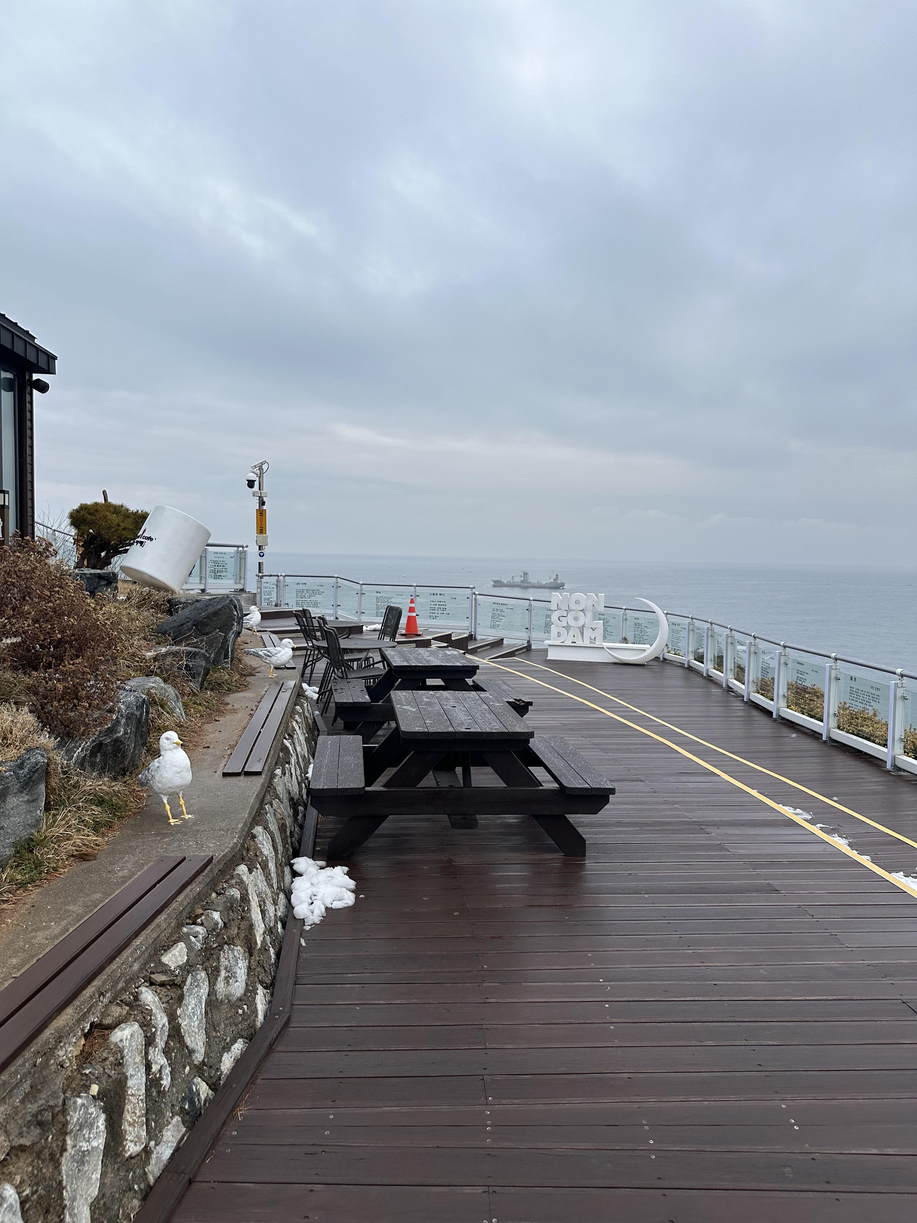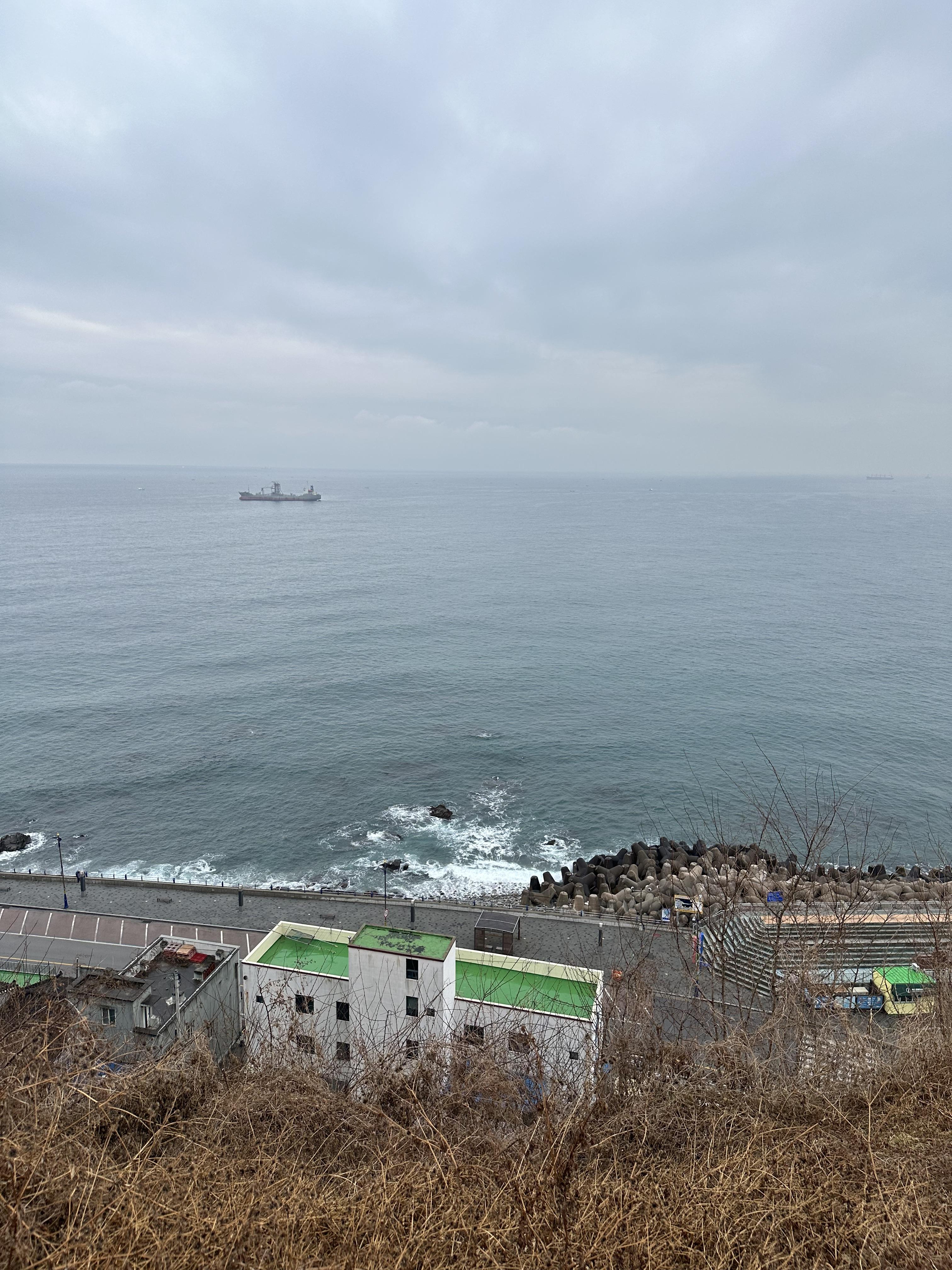전날에 게스트하우스 체크인전에 짐을 맡기면서 보았지만 아침에 일어나서 보는 논골담길의 뷰는 힐링 자체였습니다. 아침에 일어나서 이러헥 바다와 산을 보며 산책 할 수 있는곳이 얼마나 될까요. 103LAB에서 묵호 바람의 언덕까지는 특별한 오르막길도 계단도없이 정말 가볍고 편하게 묵호 바람의 언덕 위에 올라가서 이렇게 뷰를 볼 수 있고 조금 더 일찍 일어난다면 일출도 볼 수 있습니다. 이날 묵호는 전날에 비도 살짝 오고 흐린날씨여서 일출은 보지 못했습니다. 3년전 묵호 방문했을 때도 일출은 제대로 보지 못했으나 날씨가 좋은날 묵호를 간다면 일찍 일어나서 일출보는것을 추천해요! 일출보지 못하더라도 이렇게 높은 언덕위에서 바라보는 동해바다와 산 전망은 힐링 그 자체입니다.