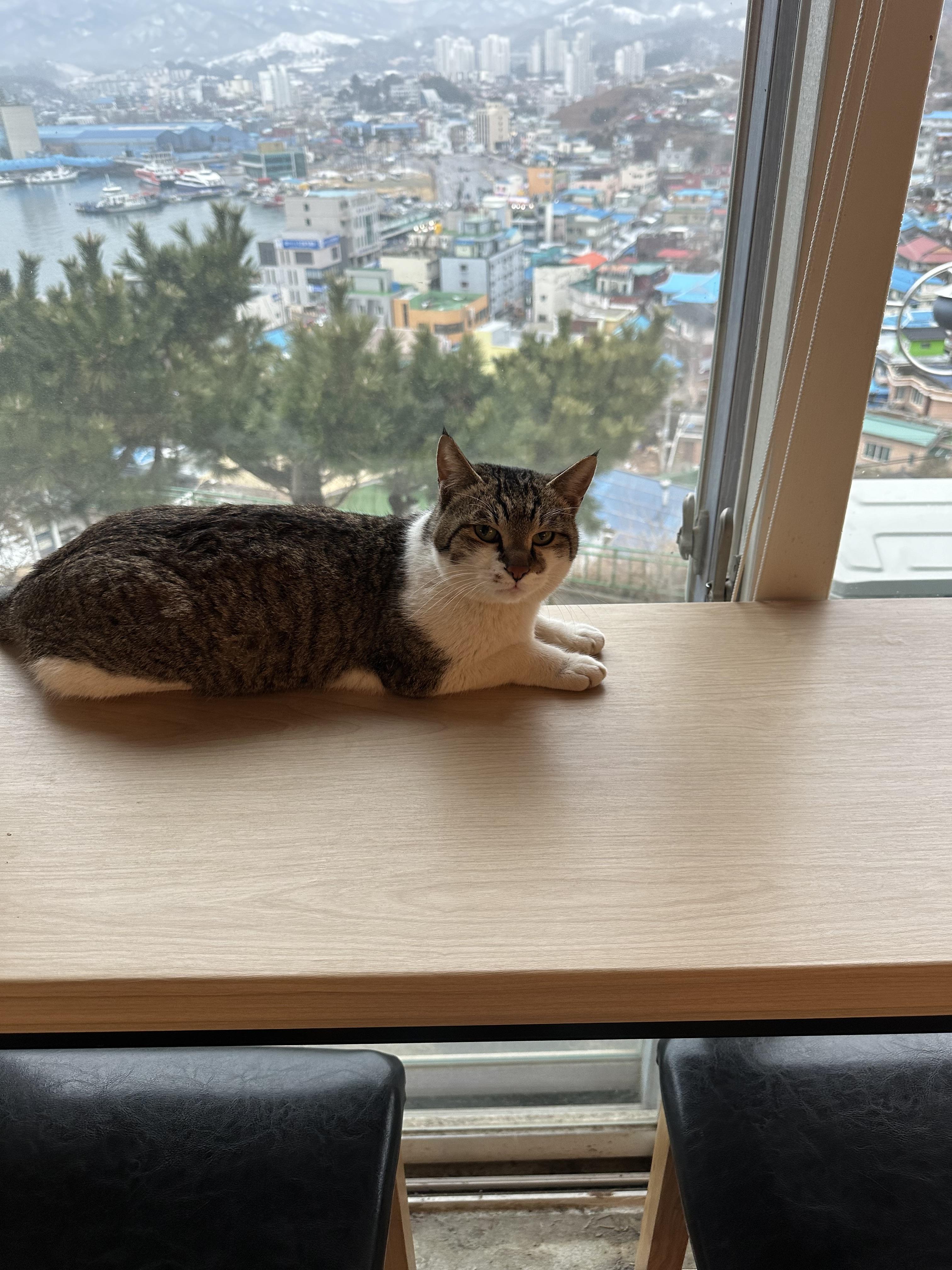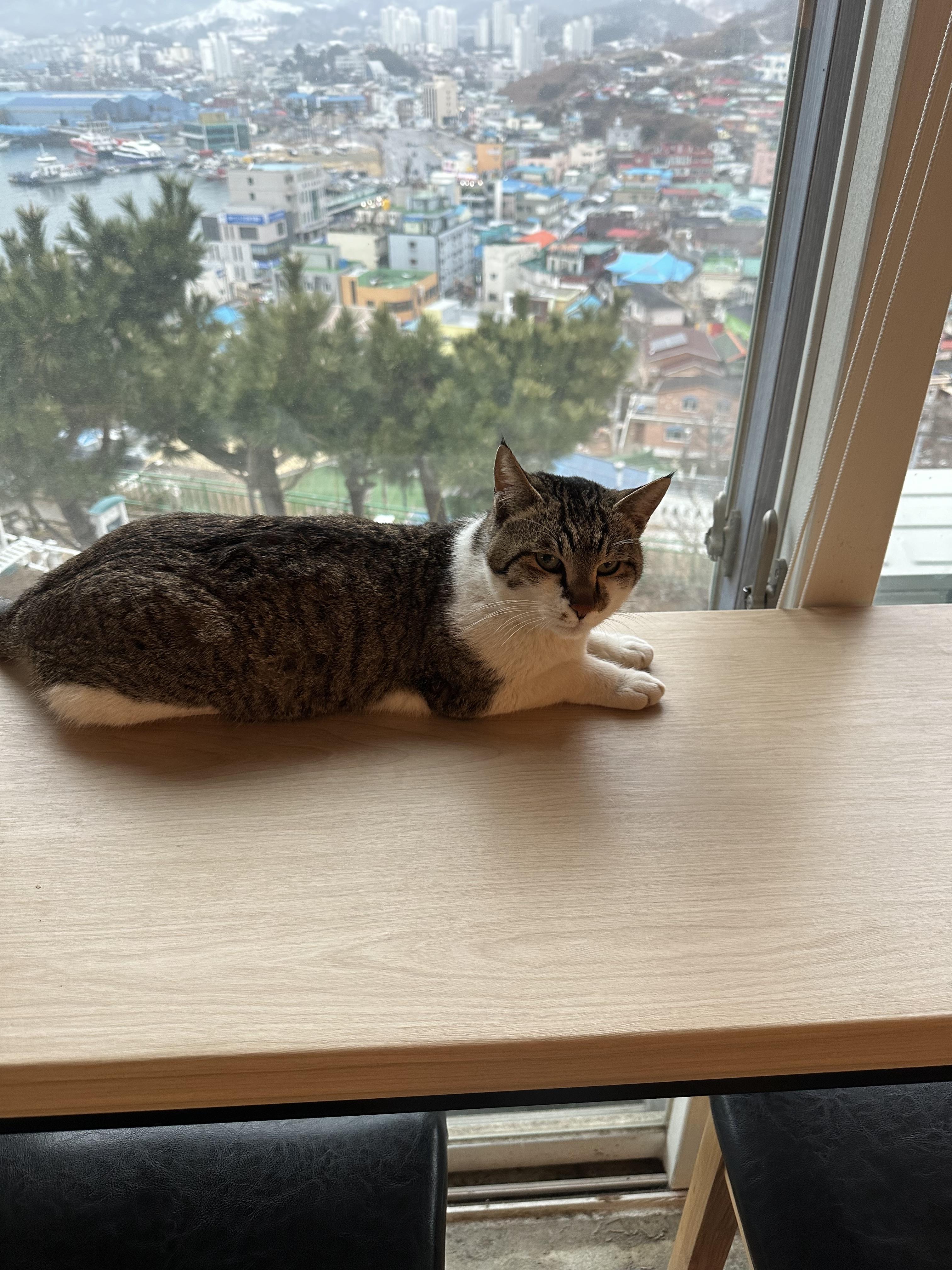 논골담길 마을을 돌아보고 오니까 마침 조식 시간이 되었는지 사장님 부부랑 함께 고양이들도 왔스빈다. 치즈냥이가 검은 고양이가 있었는데 치즈냥이도 멀리 보이는 바다와 산을 보고 있었습니다. 보통 길고양이들은 도시에서 굶주림과 위협을 느낄텐데 논골담길을 찾는 고양이들도 103LAB 게스트하우스를 통해 휴식도 취하면서 정말 편하게 지는 것 같습니다.