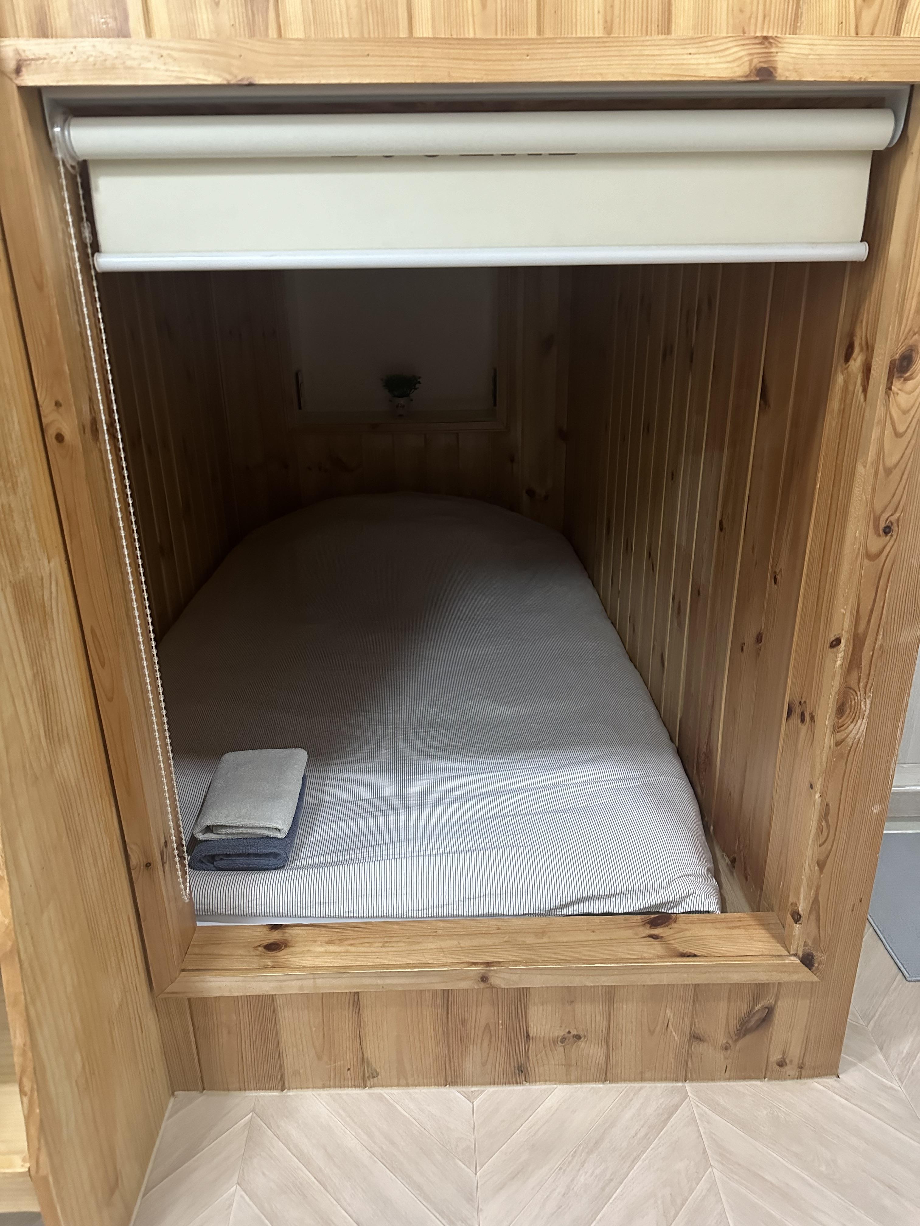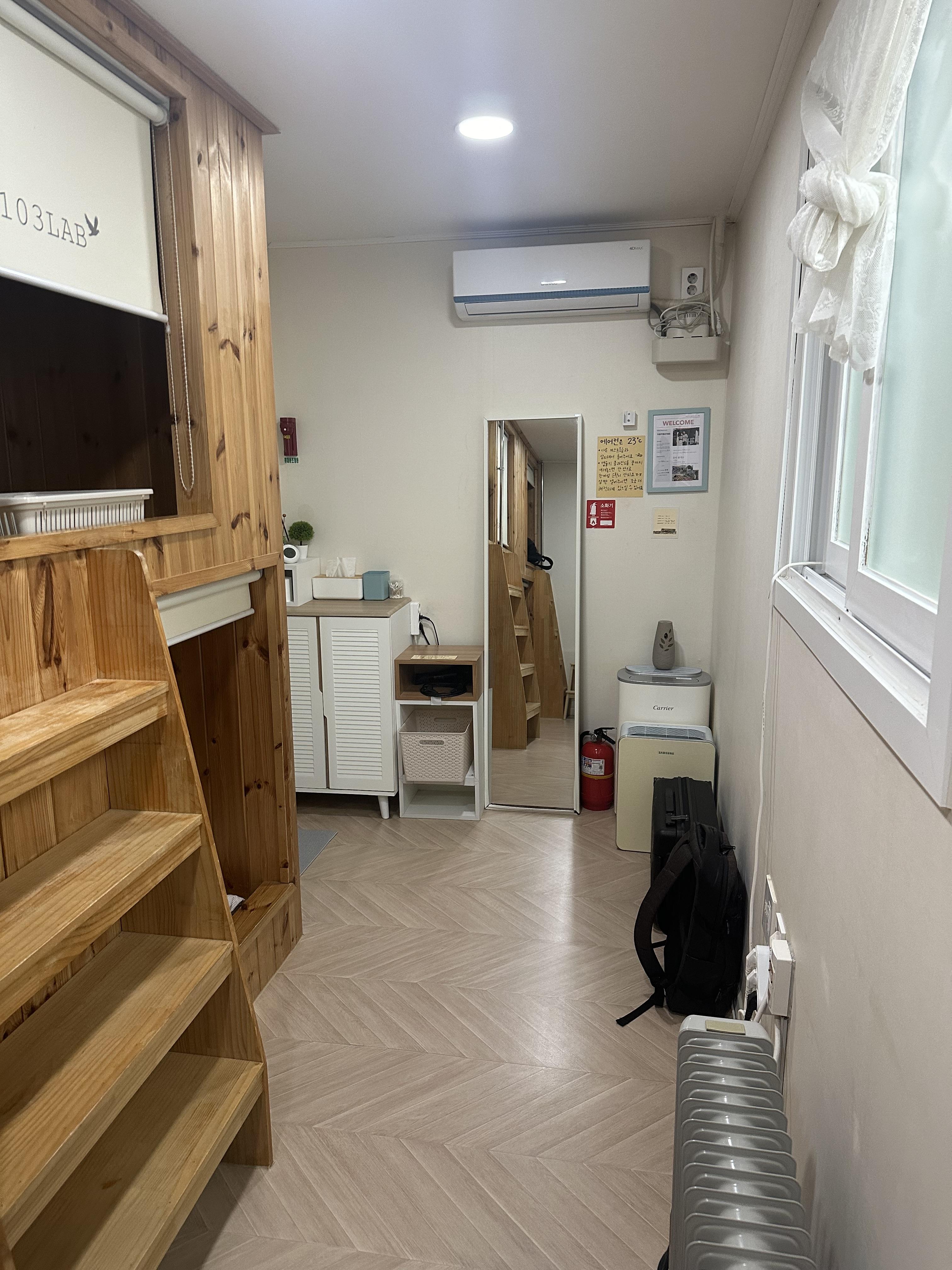 객실은 넓지 않은 구조였습니다. 좌측으로는 캡슐형 2층침대가 있었습니다. 프라이버시한 공간을 느낄 수 있도록 블라인드로 내려서 자신만의 공간으로 만들 수 있습니다. 게스트하우스에 갔는데 침대가 다 뚫려 있는 게스트하우스는 느낌이 그렇더라구요. 이렇게 캡슐형 침대구조로 다른 게스트하우스들과 차단이 되다보니 좀 더 편했습니다. 커튼도 없고 침대만 있다면 다른 게스트들의 잠자는 모습부터 심지어 보면안되는것까지 약간 민망함까지도 들 때 있었는데요 개인적으로 저는 이런 게스트하우스들을 많이 선호했습니다. 제가 자주 가는 통영 슬로비게스하우스도 커튼과 벽을 통해 게스트들과의 쓸모없는 접근을 허용하지 않았습니다. 또한 처음 입실 때부터 사장님이 침대번호를 지정해주기 때문에 게스트하우스 측면에서도 누가 어떤 침대를 이용했는지 쉽게 관리가 될 것 같습니다. 불필요한 자리 전쟁은 안해도되는것 같습니다. 6인실 객실이지만 3인만 신청받고 있더라구요. 그래서 개인 짐같은 경우는 2층 침대에 바구내에 보관할 수 있엇습니다. 이렇게 게스트들과의 잠자는 부분이 차단되는 것은 가성비와 함께 힐링여행의 도움이 되는 것 같습니다.