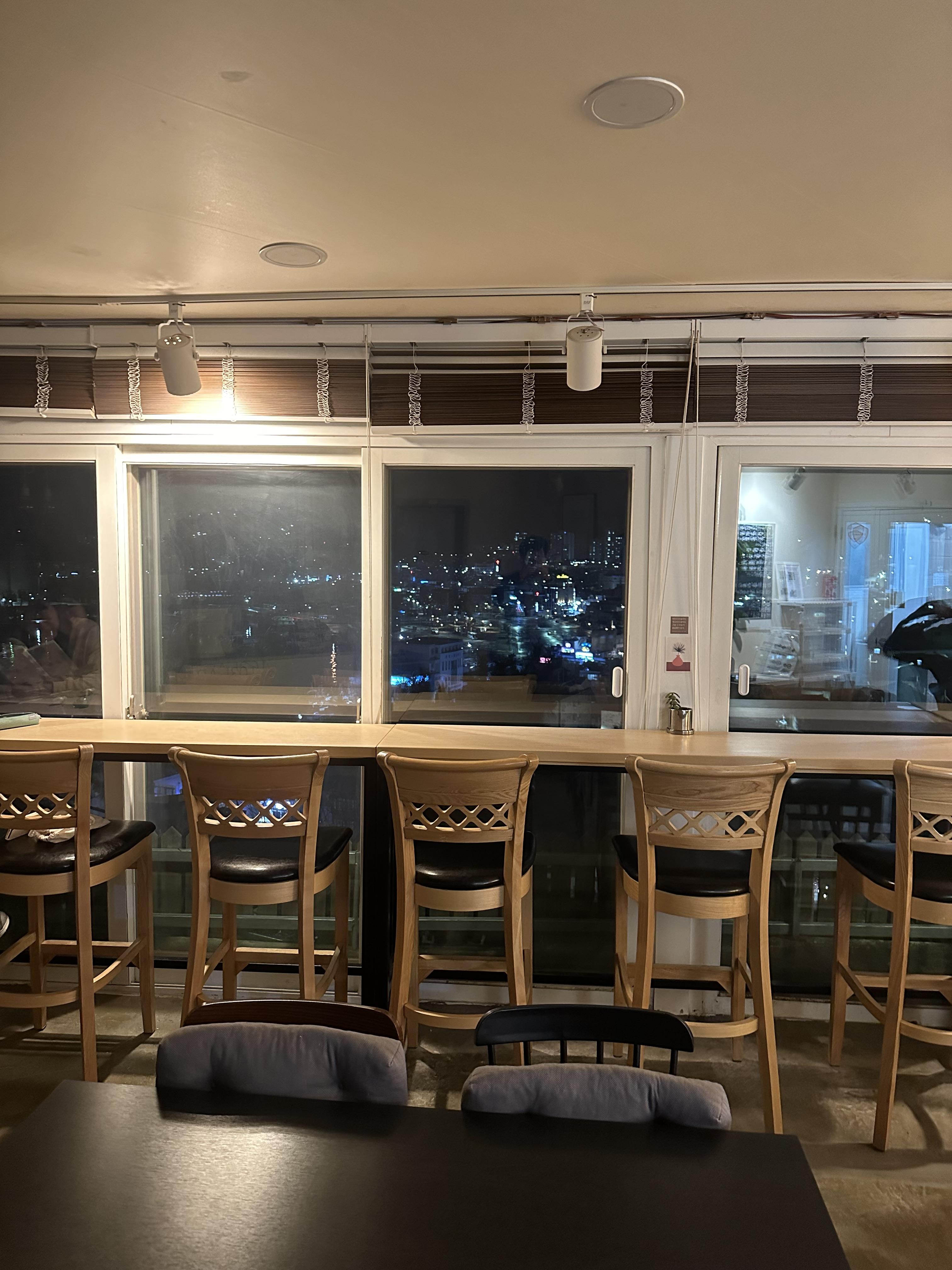 처음 입실한 시간은 8시 좀 넘어서였습니다. 103LAB게스트하우스는 출입문 들어오고나면 이렇게 카페겸 게스트하우스 공용공간으로 운영되고 있습니다. 처음 입실 했을 때는 공용공간에 게스트들이 모두 앉아 휴식을 취하고 있었는데, 이 사진은 밖에 돌아다니다가 좀 한적할때 들어와서 찍은 사진입니다. 18시 이후부터는 카페 영업이 끝나기 때문에 게스트들이 좀 더 자유롭게 앉아서 묵호를 바라보며 쉴 수 있습니다. 체크인하더라도 카페는 이용할 수 있습니다. 가운데 사진을 보시는 것처럼 103LAB 게스트하우스에서는 논골담길이라는 달동네 같은 높은 곳에 위치해 있기 때문에 바다와 산을 넓게 볼 수 있습니다. 밤이라서 바다와 산은 보이지 않지만 묵호의 밤을 그대로 느껴졌습니다.