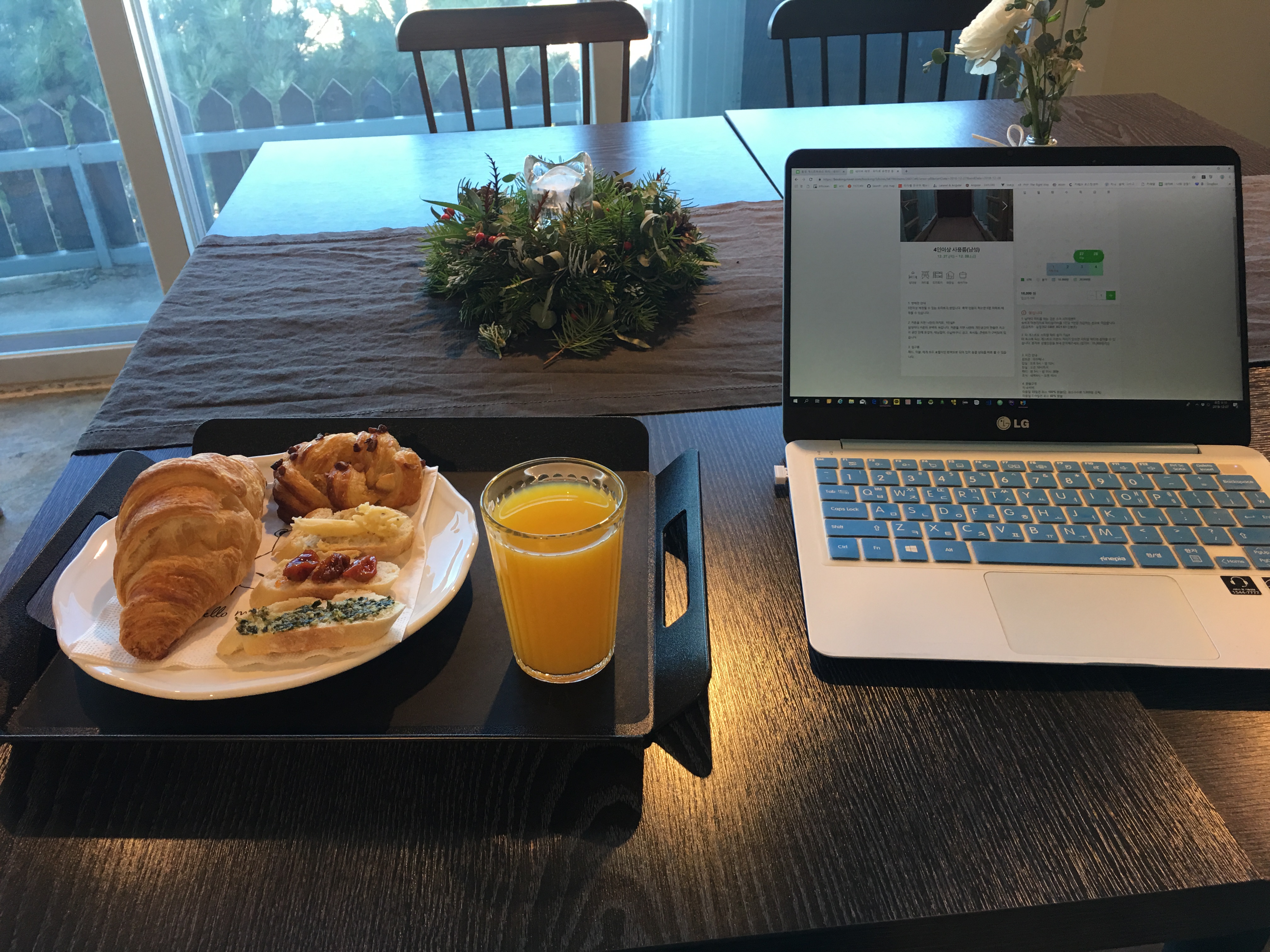 3년만에 103LAB 게스트하우스 왔습니다. 이렇게 오랜만에 103LAB 게스트하우스에 오니까 처음 왔을때가 생각났습니다. 당시에는 날씨도 좋아서 하늘도 정말 파랗고 좋았습니다. 그당시에는 창가쪽에 테이블이 없었는데요. 사실 그 당시 103LAB을 선택할 때 토스트가 아닌 갓 구운 빵과 오렌지쥬스였는데 게스트하우스에 온 느낌보다 정말 좋은 숙소 와서 밥먹고 가는 느낌이었습니다.