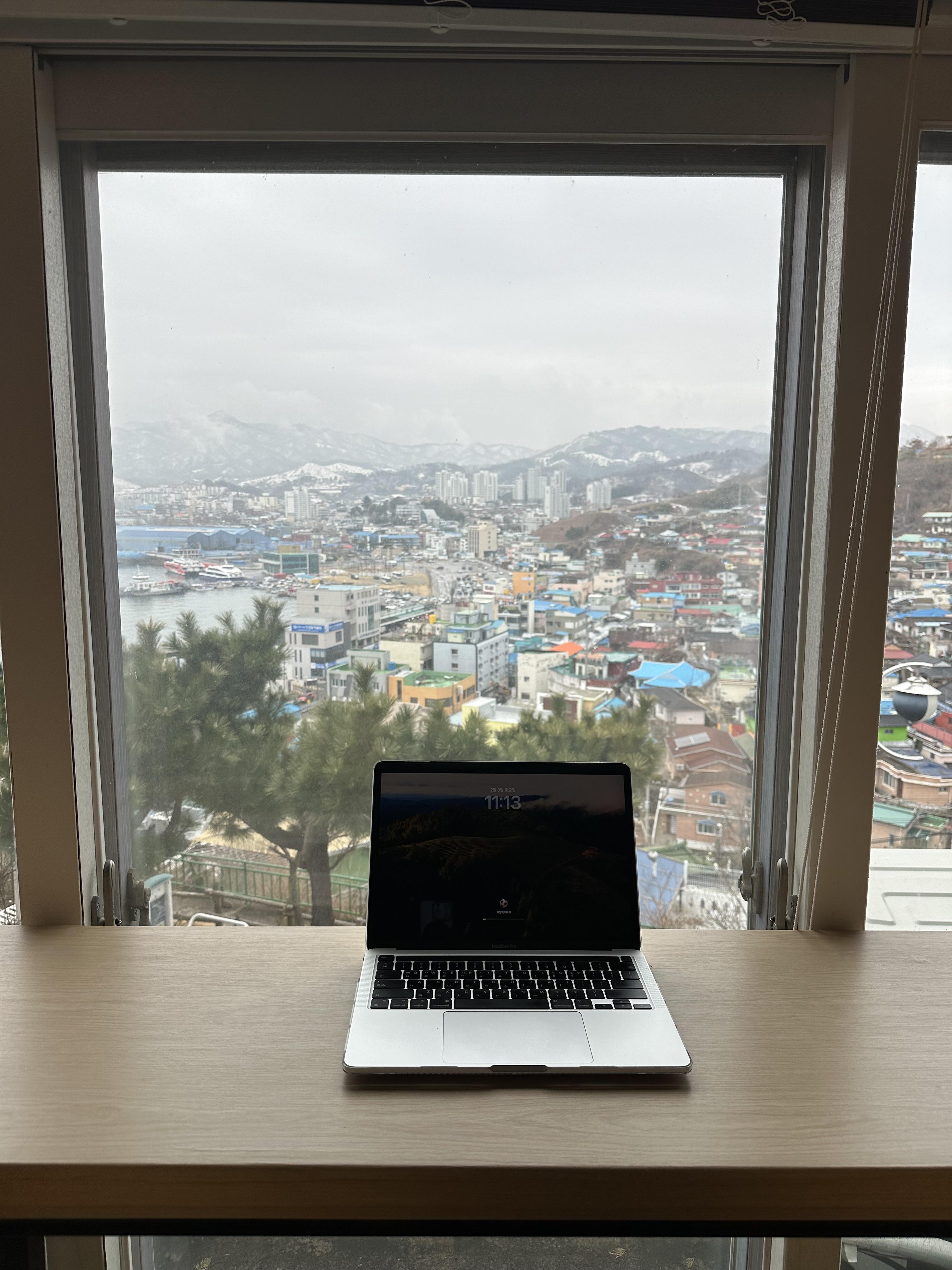도째비골 스카이밸리를 다녀오고 다시 103LAB 게스트하우스에 왔습니다. 이제 게스트하우스는 체크아웃 후 사장님께 청소하는거 같았습니다. 두번째 여행은 강릉을 지나 속초로 가는 것이었습니다. 강릉으로 가는 누리로 열차 타기까지는 2-3시간정도 남았습니다. 103LAB에서 산과 바다가 보이는 방향이 노트북을 놓고는 자리를 잡았습니다.