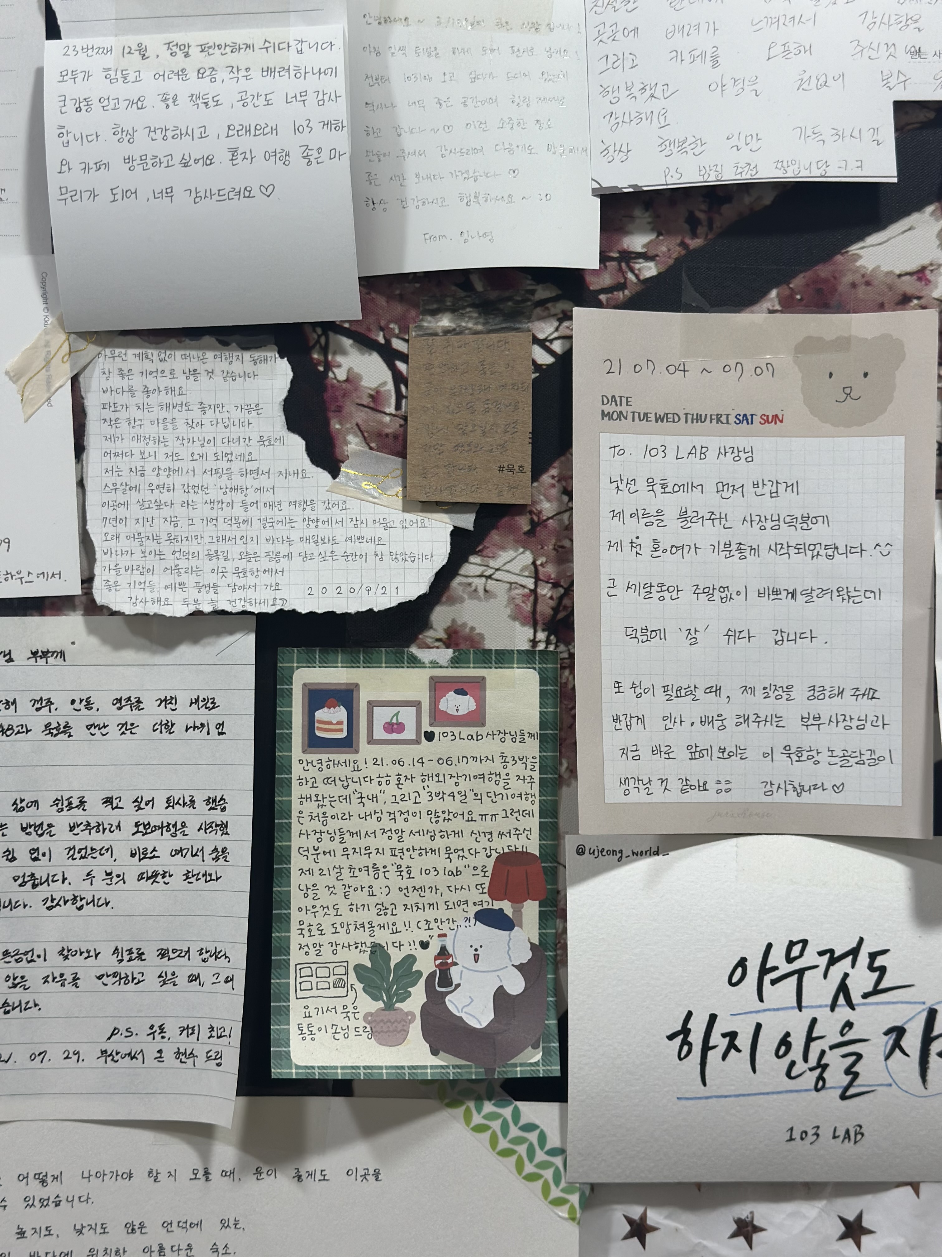 103LAB 게스트하우스는 직장생활을 하면서 어쩌다가 찾게된 힐링 여행지였습니다. 그것은 저뿐만 아니라 모든 게스트들이 묵호와 103LAB 게스트하우스를 찾는 이유같습니다. 그리고 그런 혼자 여행객들을 위해 103LAB 게스트하우스를 지켜주시는 사장님 부부에게 감사의 인사를 전합니다. 세상을 살다보면 남을 위하는 일보다 수익을 쫓는 일들이 대부분인데요. 그래서 여행 숙소를 다니다보면 손님에 대한 진정성은 잘 보이지 않는곳들이 많습니다. 코로나 이전에는 게스트하우스가 파티가 유행했었는데요. 일부 사장님들은 파티 진행을 통해 손님을 받고 수익을 올리는데 중점을 두고 그 이후에는 진심은 찾아보기 힘들었습니다. 결국 수익을 쫓는데만 일하다보면 초반에는 돈을 많이 벌 수 있지만 오래 가지는 못하는 것 같습니다.