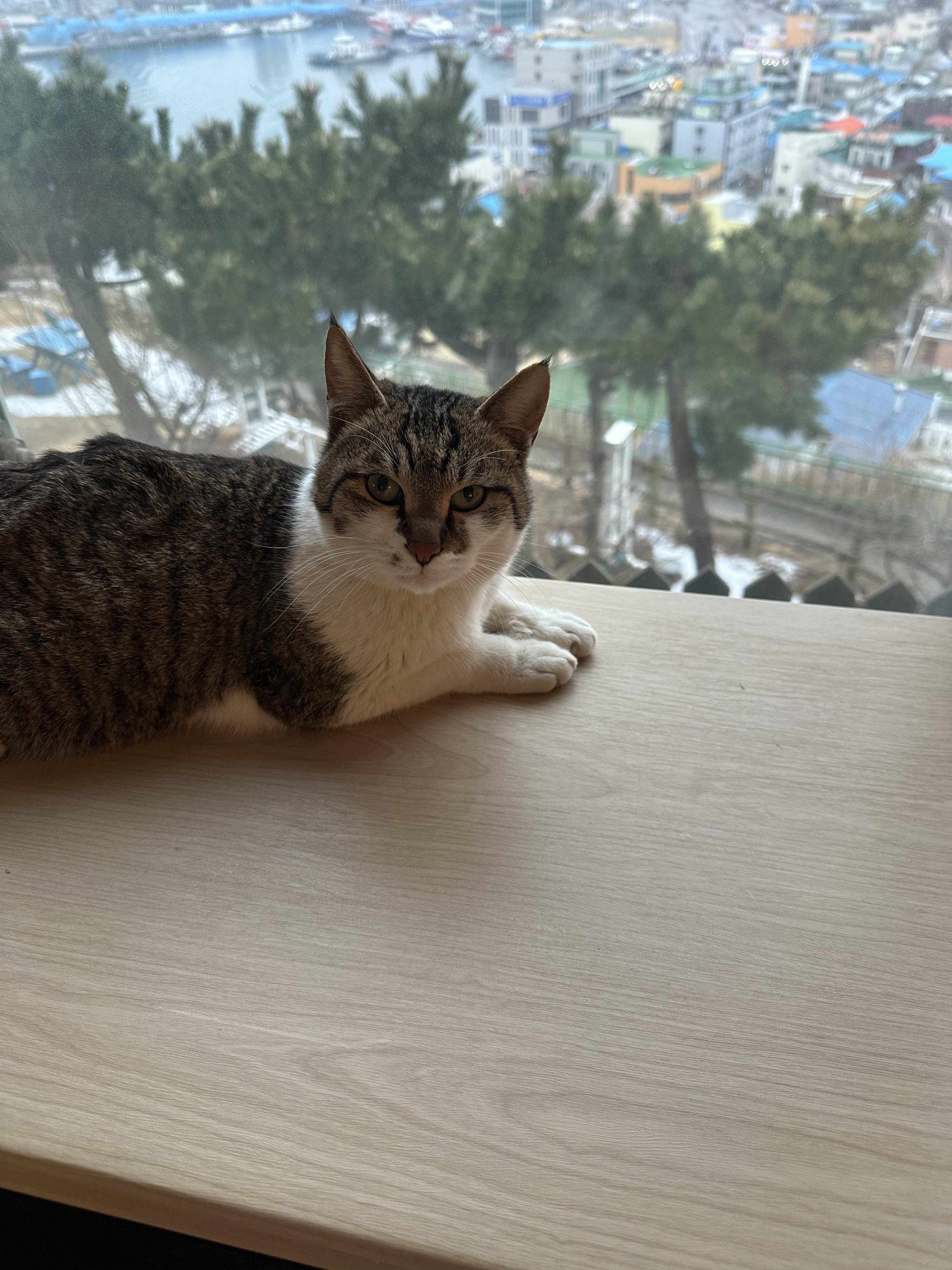 잠시 묵호 바람의 언덕과 논골담길 산책 후 도미토리에서 샤워하고 나왔는데요. 귀여운 고양이 한마리가 103LAB 공용공간에 이렇게 앉아있었습니다. 사장님 부부가 직접 키우는 고양이도 있지만 103LAB 게스트하우스에는 동네 길고양이들도 문이 열린 틈을 타서 자유롭게 들어오곤합니다.