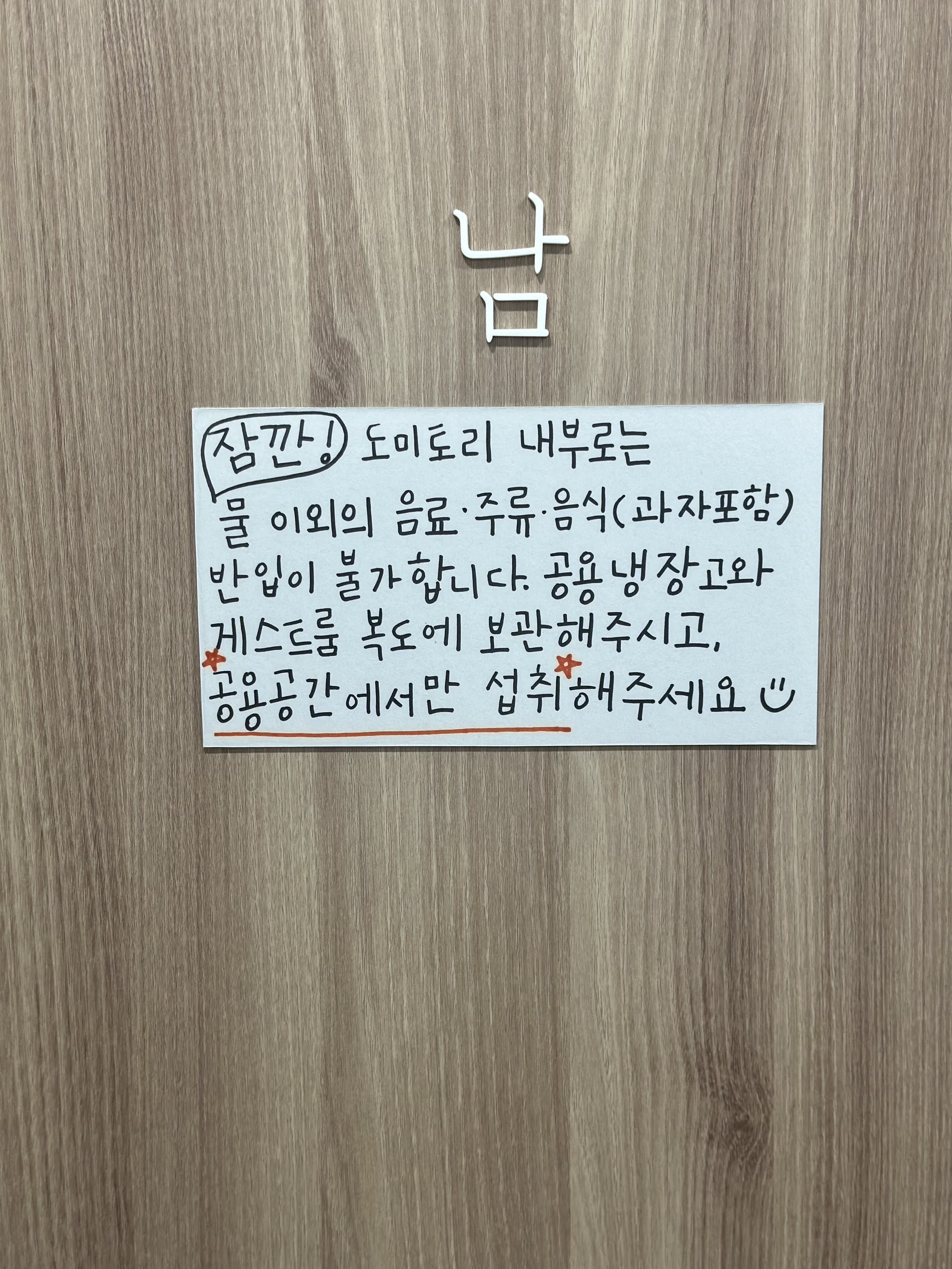 - 도미토리 안으로는 음식 및 음료반입이 안되요.
