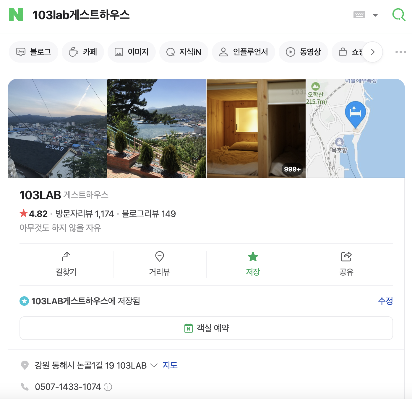 강원도 동해 묵호 논골담길에 위치한 103LAB 게스트하우스는 네이버나 다음에서 103LAB게스트하우스라고 검색하면 쉽게 노출 되는 것을 확인 할 수 있습니다.