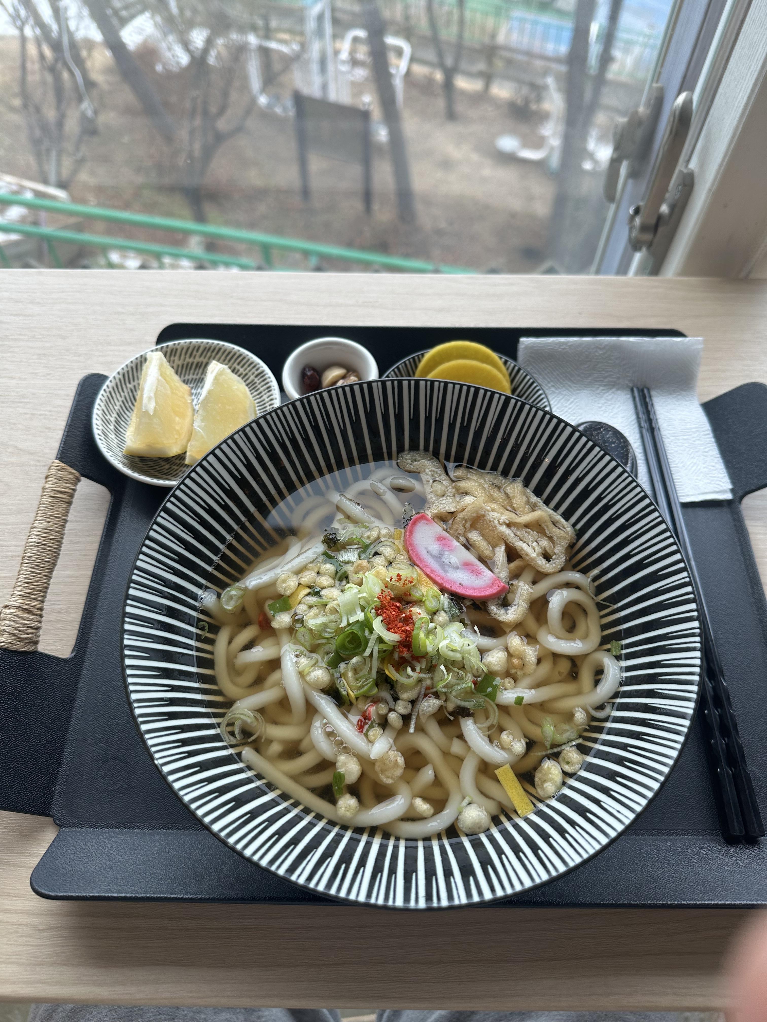 조식시간은 8시반 부터 9시반까지입니다. 미리 신청한 사람에 대해서 먹을 수 있다고 합니다. 요즘 다른 게스트하우스 조식을 어떨지 모르겠는데요. 예전에는 게스트하우스 조식은 전부 토스트였습니다. 제가 103LAB 게스트하우스 처음왔을 때는 조식으로 갓 구운 방과 오렌쥬스 였는데요. 그동안은 저렴한 게스트하우스를 다녀서 잘 몰랐는데 돈이 조금 더 들어가는 게스트하우스의 경우 그만큼 더 맛있고 정성스러운 조식이 들어가는것 같았습니다. 사장님이 직접 일찍 나와서 토스트를 구워주면 모를까 그냥 알아서 챙겨먹으라고 하다보면 귀찮아서라도 안먹고 갈수도 있구요. 또한 막상 먹으려고 하는데 유통기한이 지난 음식일 때 참 곤란하죠. 사장님이 직접 우동을 끊여주고 오렌지와 땅콩이 함께 반찬으로 나옵니다. 추운 겨울날 겨울 여행 2일차를 따뜻하게 시작 할 수 있었습니다.
