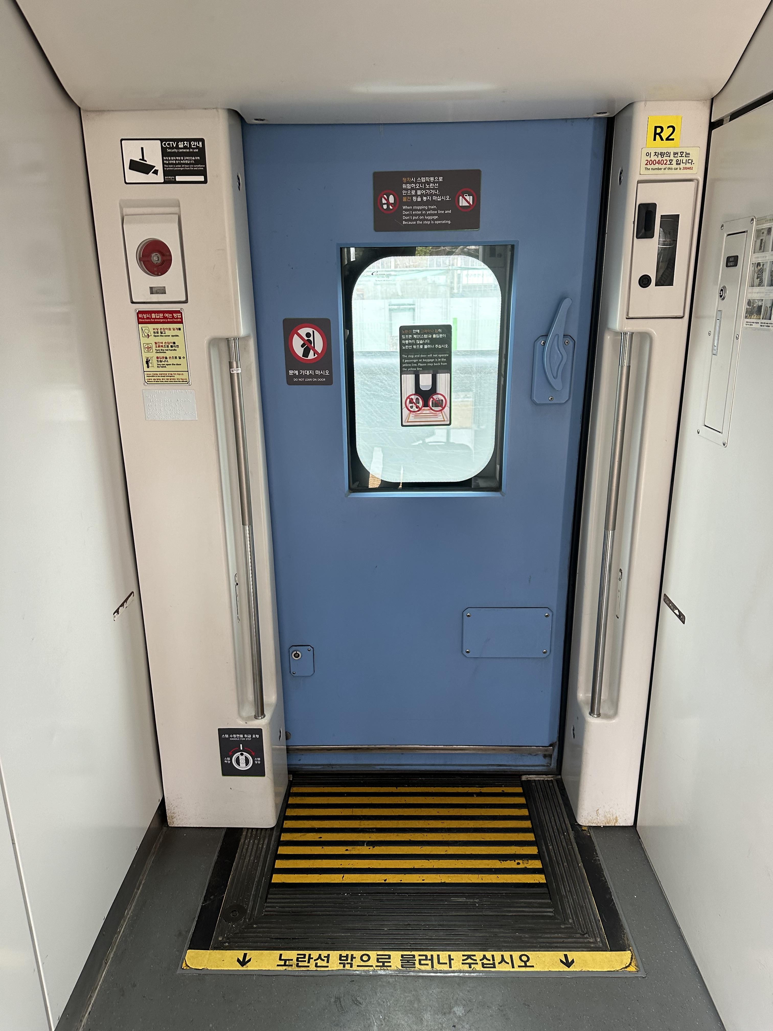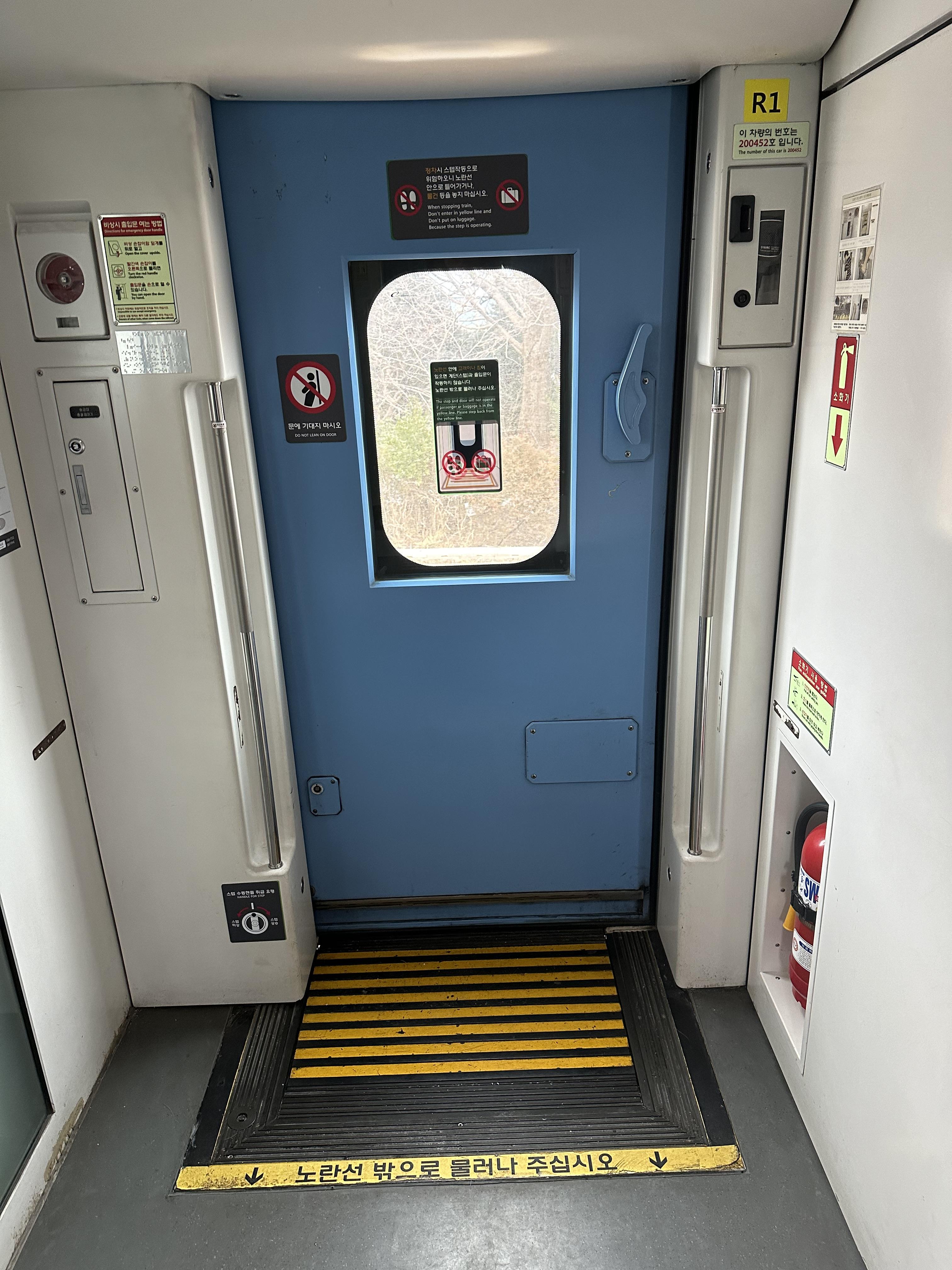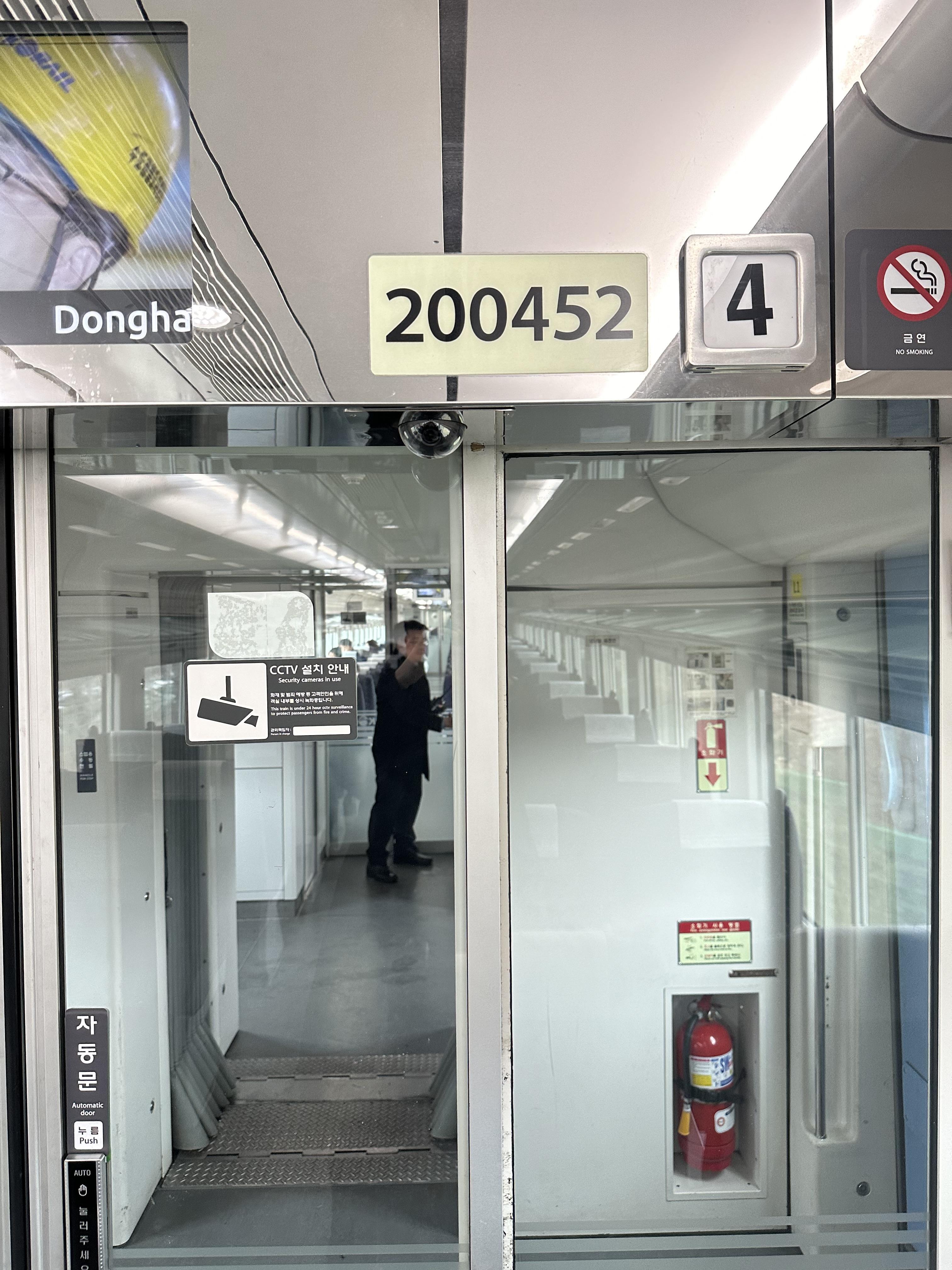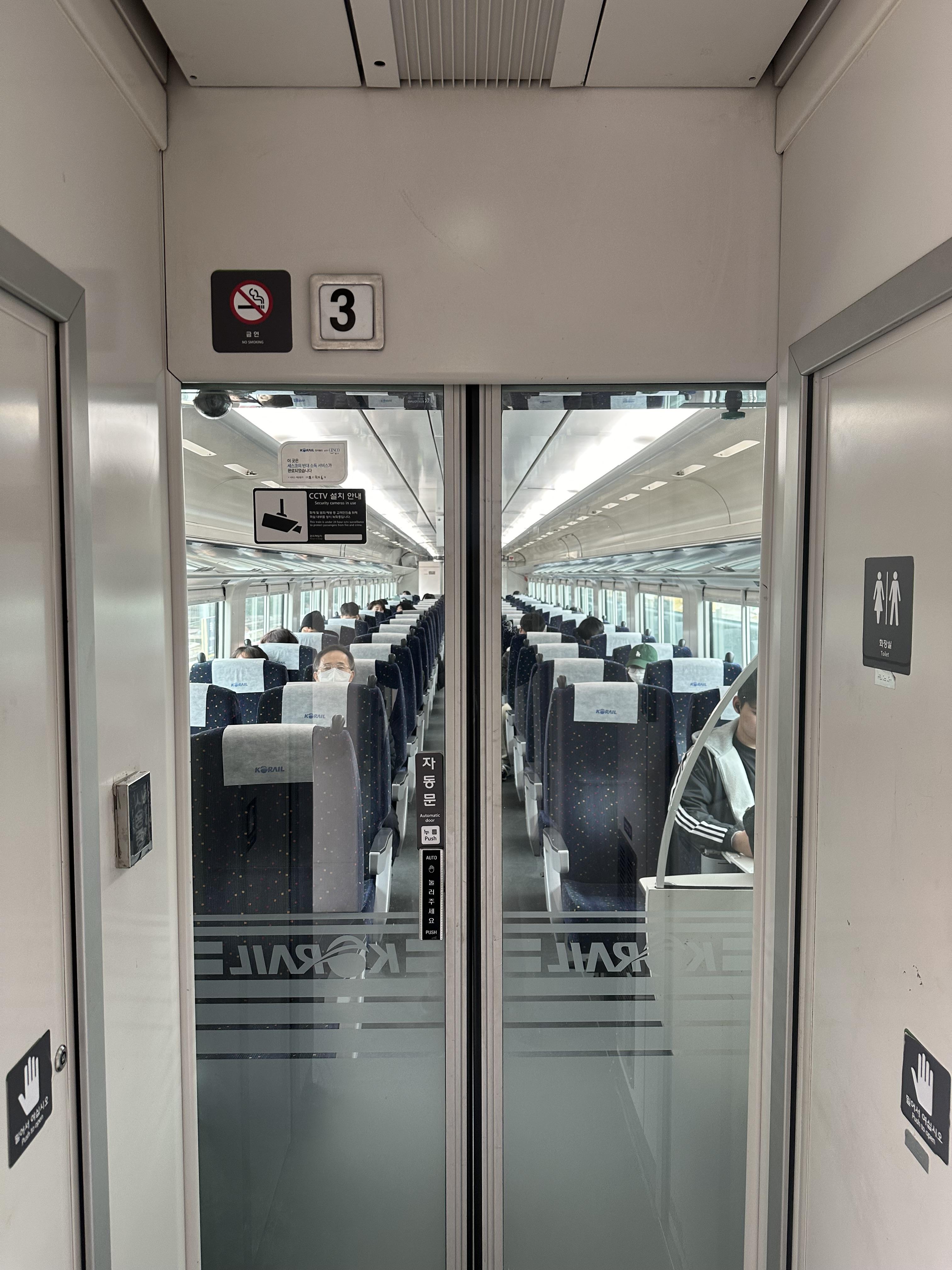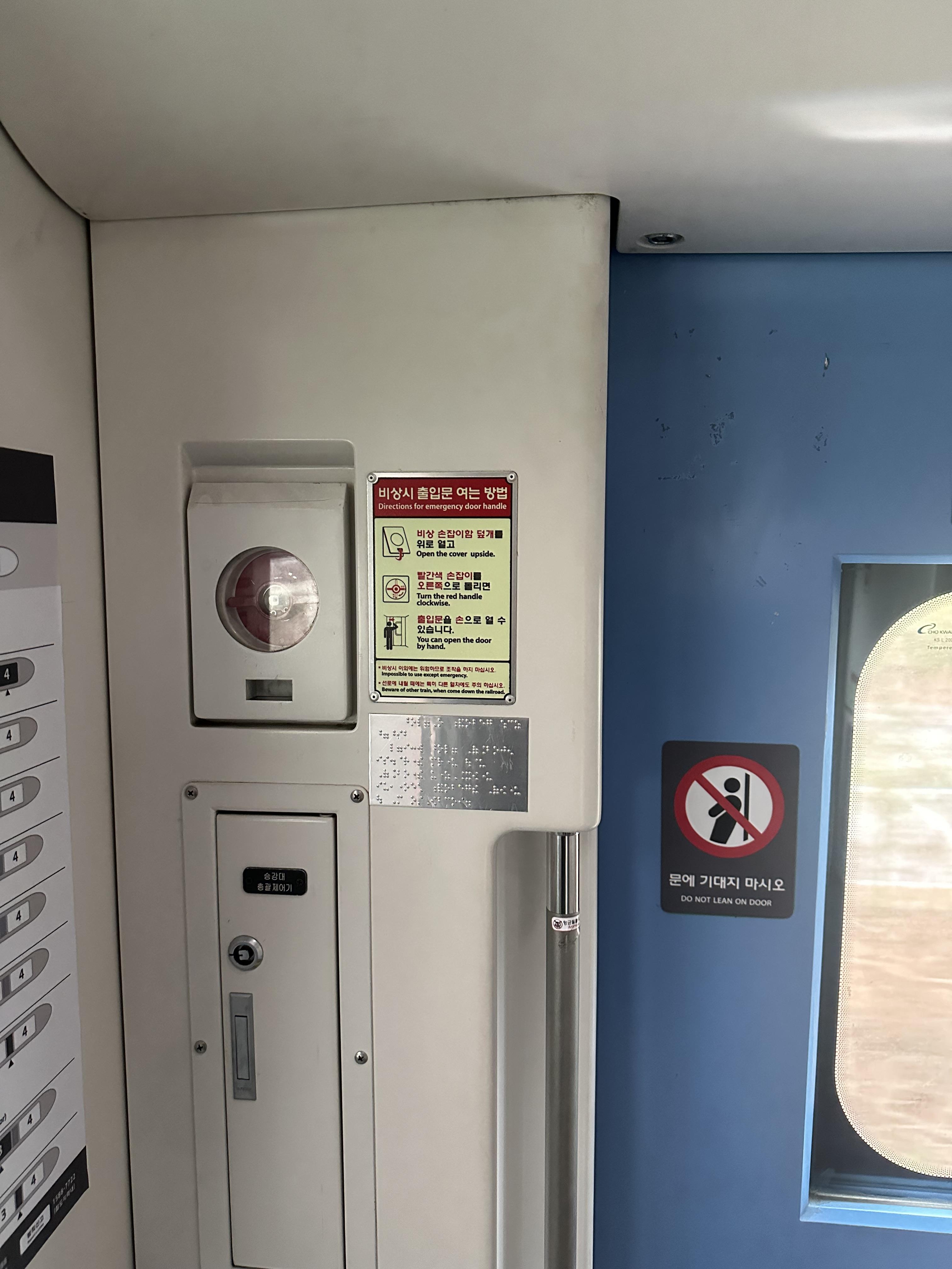 ITX 마음 열차나 KTX 이음 등 다른 열차와 다를 바 없이 차내 안전 장비도 설치되어 있었습니다. 비상시 창문을 깨는 망치는 당연히 설치 되어있었습니다. 객실 중간과 객실 통로로 나가는 자동문 위에도 모니터가 설치되어 있어 현재 열차의 정보 및 다음 정차역에 대한 정보를 확인 할 수 있습니다 객실 뒤에는 캐리어와 같은 짐을 보관할 수 있는 공간도 있었습니다. 일부 승객들은 캐리어나 짐의 분실의 위험으로 캐리어 공간 외에 좌석 위 천장에 두는 경우 있는데요. 기차나 비행기 등 운송수단의 경우 경우에 따라 갑자기 급정거 급정차를 통해 짐이 떨어질 수가 있느데요. 물론 짐을 떨어지기않게 두면 상관없지만 사고 시 혹은 짐이 떨여저서 다른 승객들이 다칠 수 있습니다. 짐을 올려둘 때는 떨어지지 않는지 확인 후 만약 떨어질거같으면 다른 위치 짐칸이나 캐리어 공간에 두는 것이 좋을 것 같습니다.