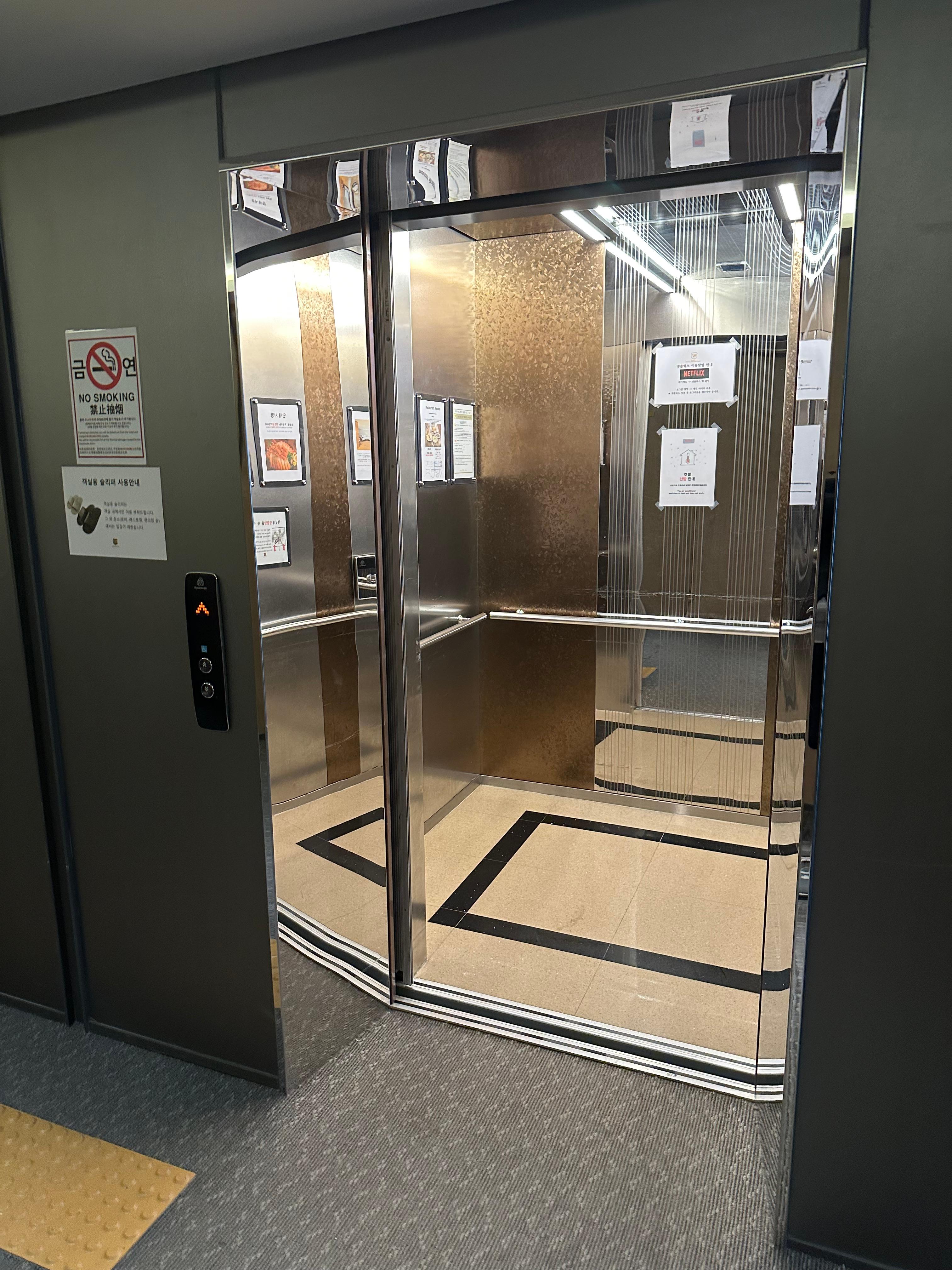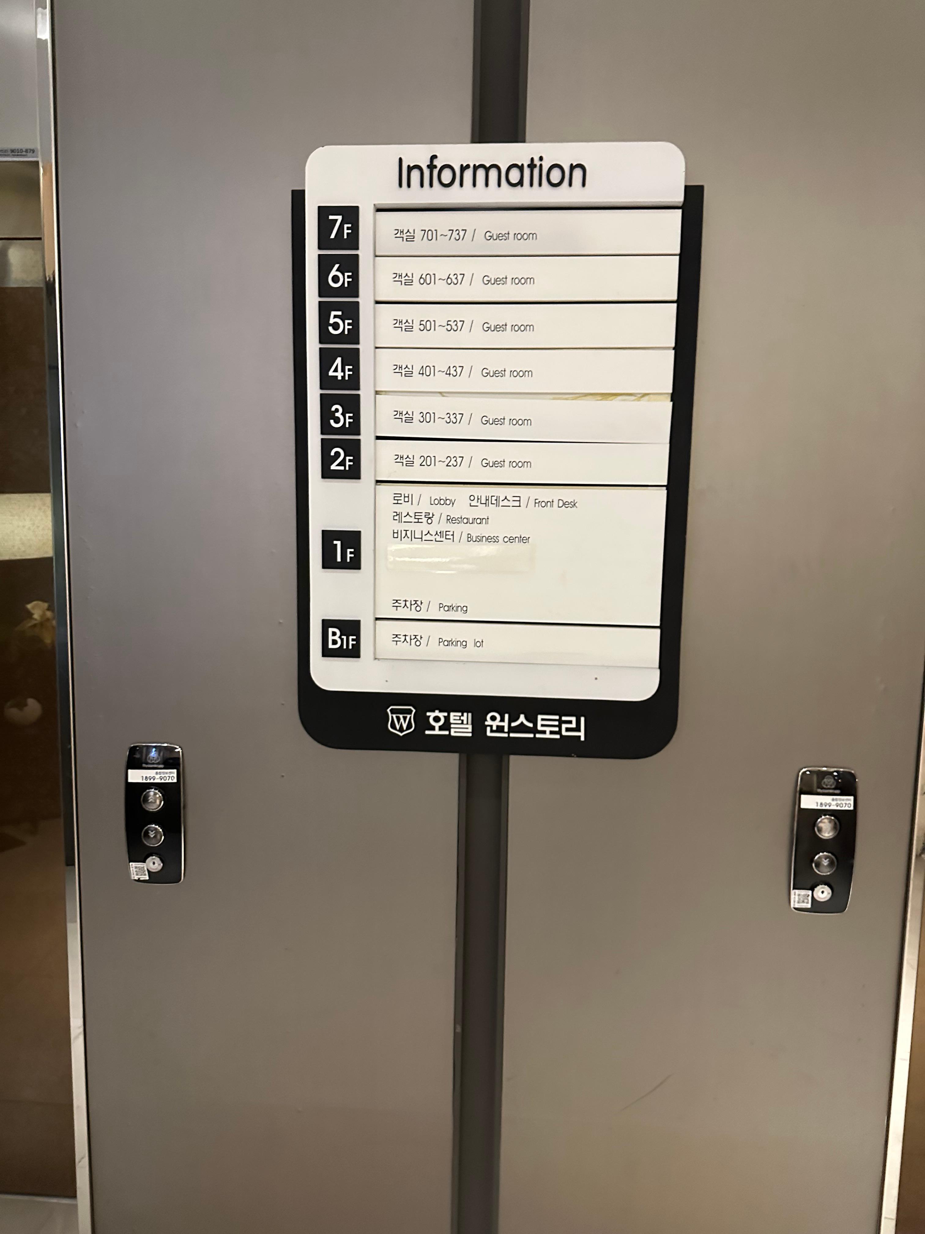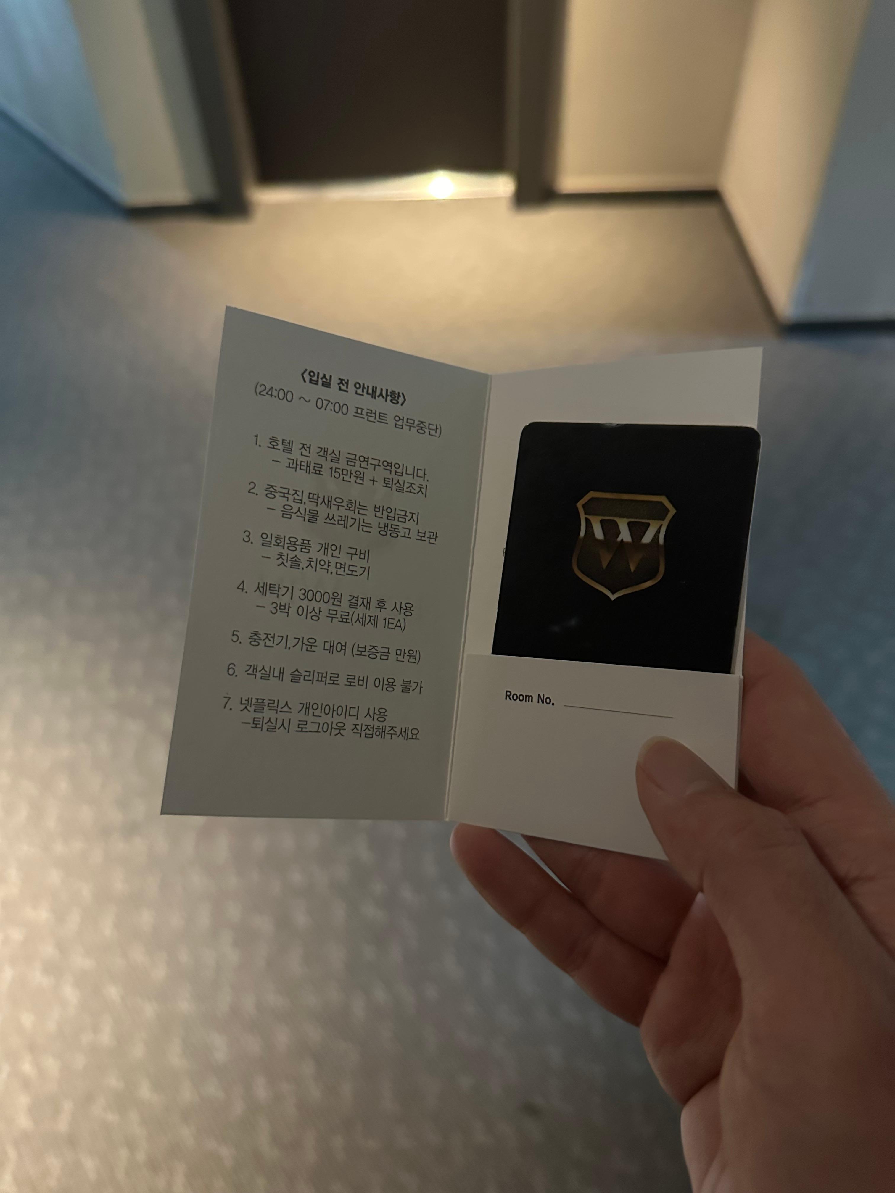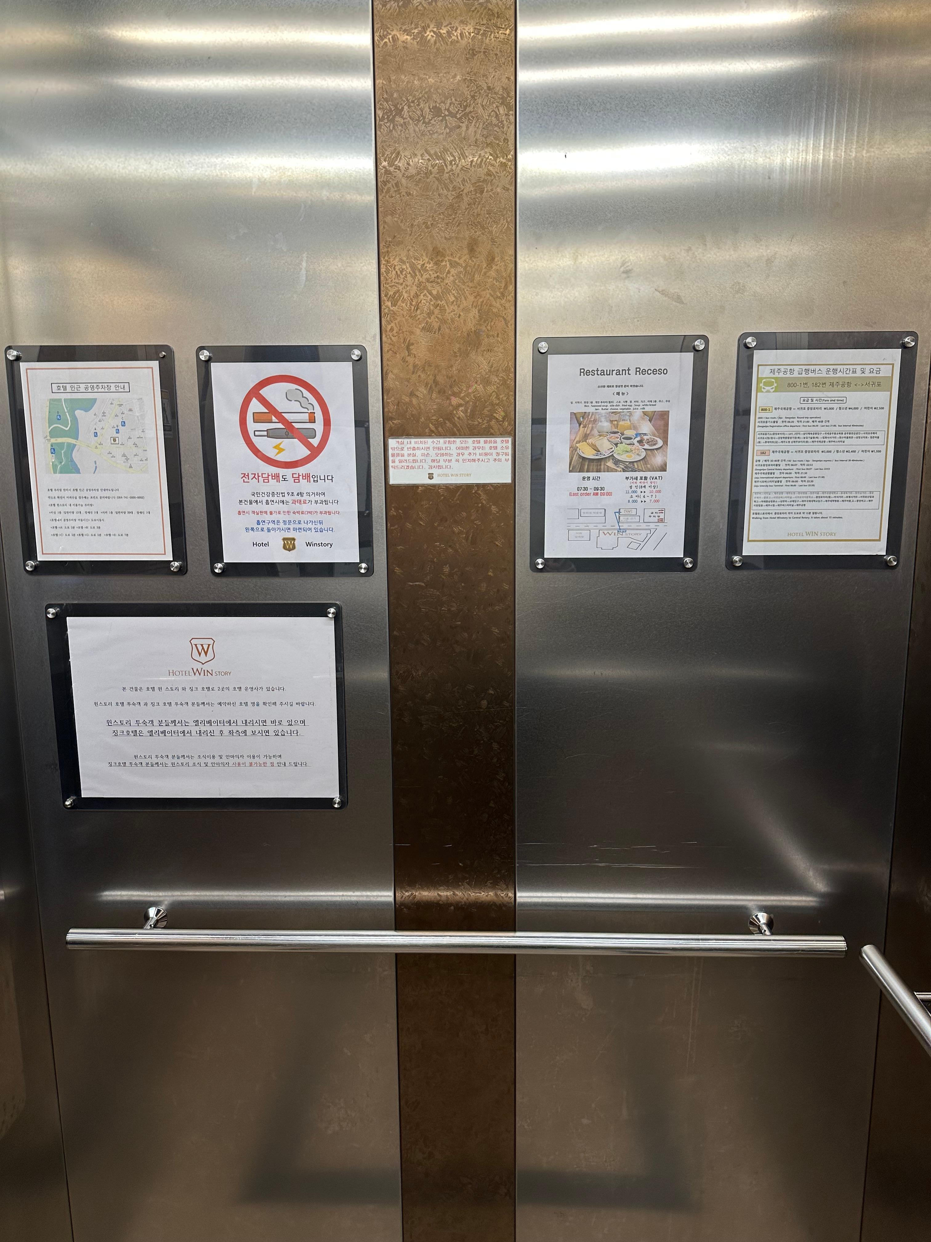 점심을 먹으니까 체크아웃 할 시간이 이제 1시간 조금 남았습니다. 저는 엘레베이터를 타고 다시 객실로 올라갔습니다. 엘레베이터 안에는 정크호텔 투숙객은 윈스토리 서비스를 이용하지 못한다는 점을 볼 수 있습니다. 그리고 객실 문앞에는 정크호텔 객실과 윈스토리 호텔이 구분되어 로고가 붙어있는 것을 볼 수 있었습니다.