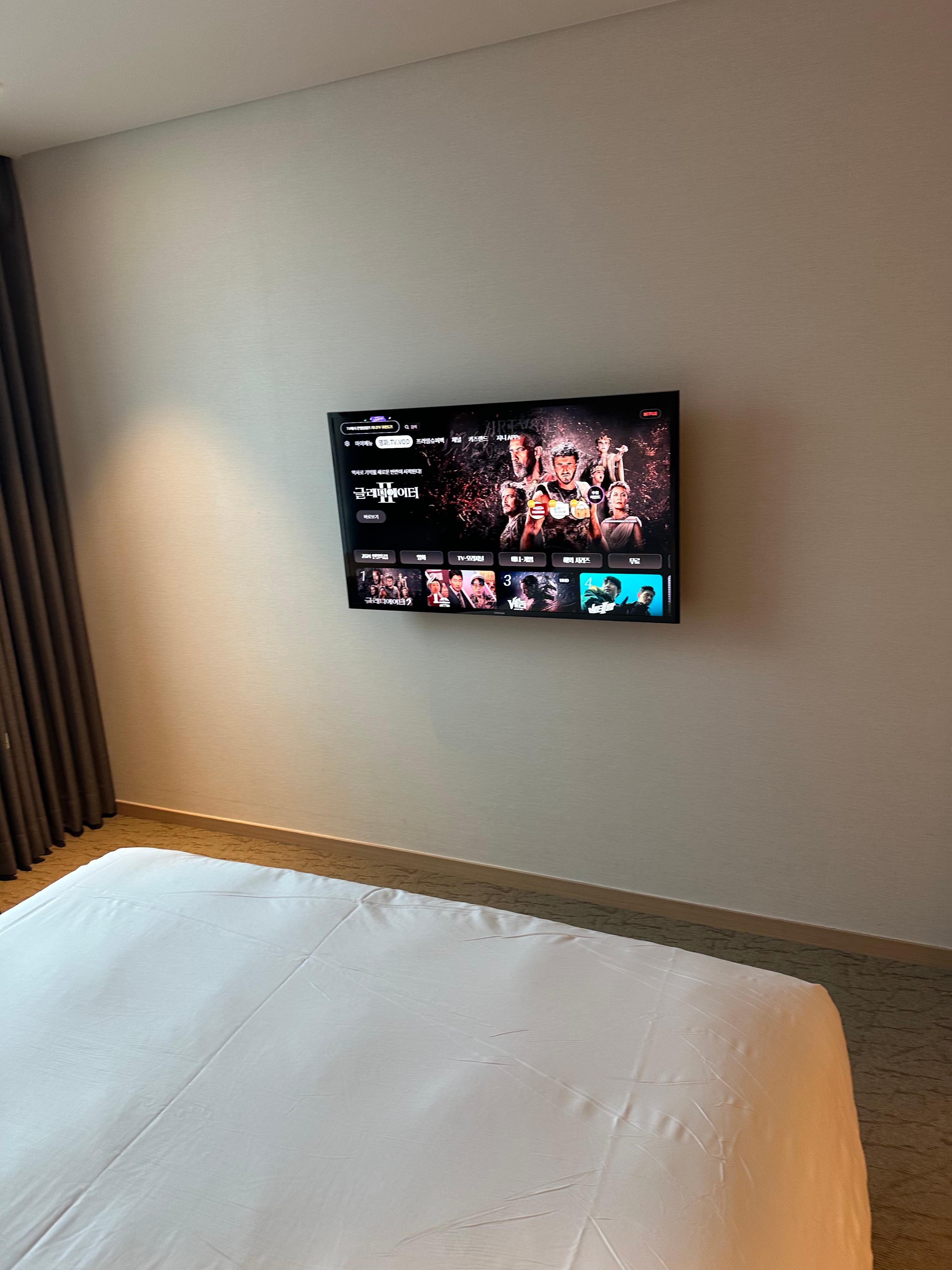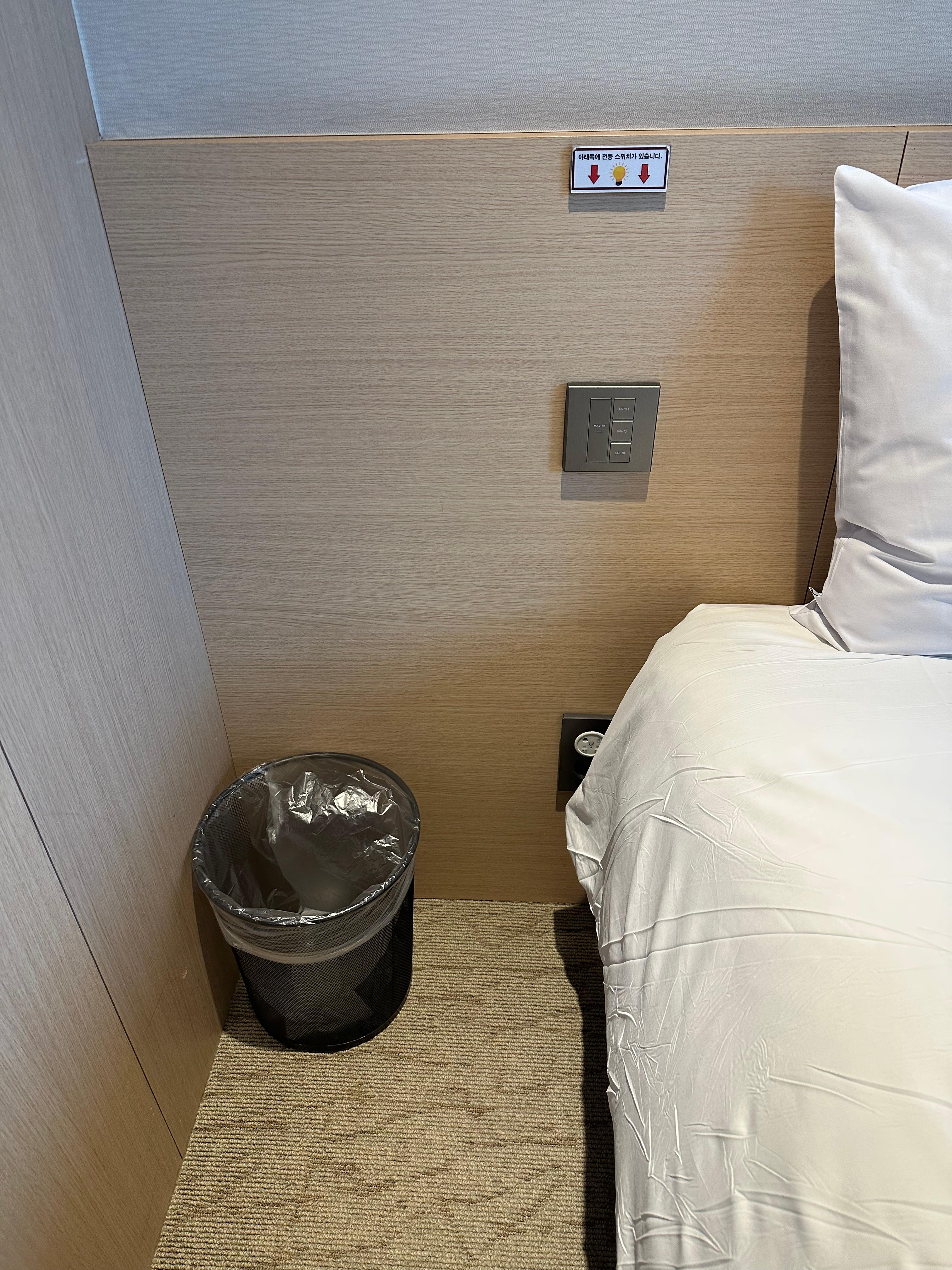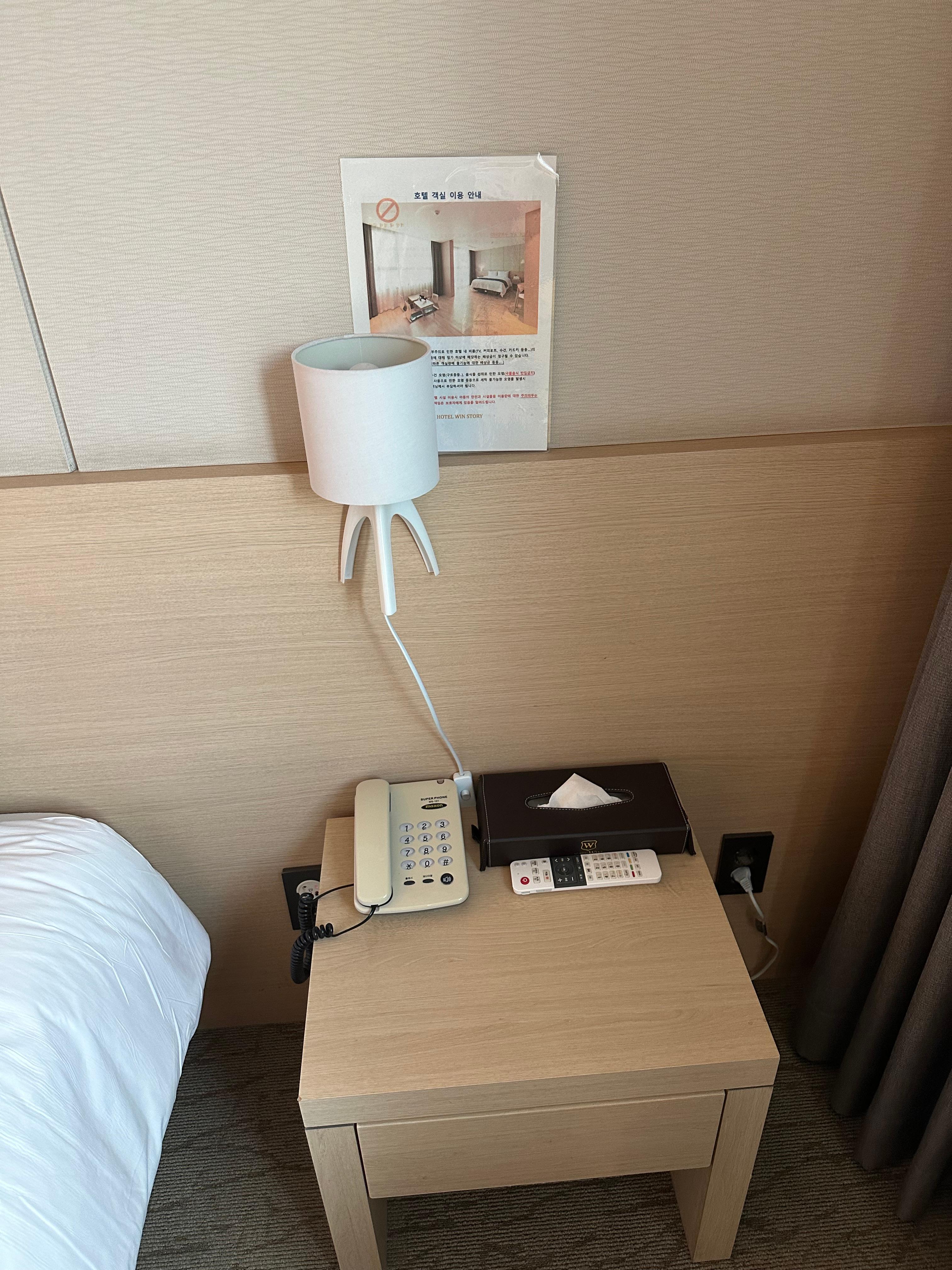 티비는 크지 않지만 넷플릭스가 되고 있는 작은 티비로 침대 바로 앞에 있습니다. 그래도 객실이 넓지 않아서 침대 위에서나 창가쪽 테이블 앞에 앉아서 보는데는 큰 문제 없었습니다. 침대 옆에는 조명과 호텔 프론트와 통화할 수 있는 전화기가 있었습니다,