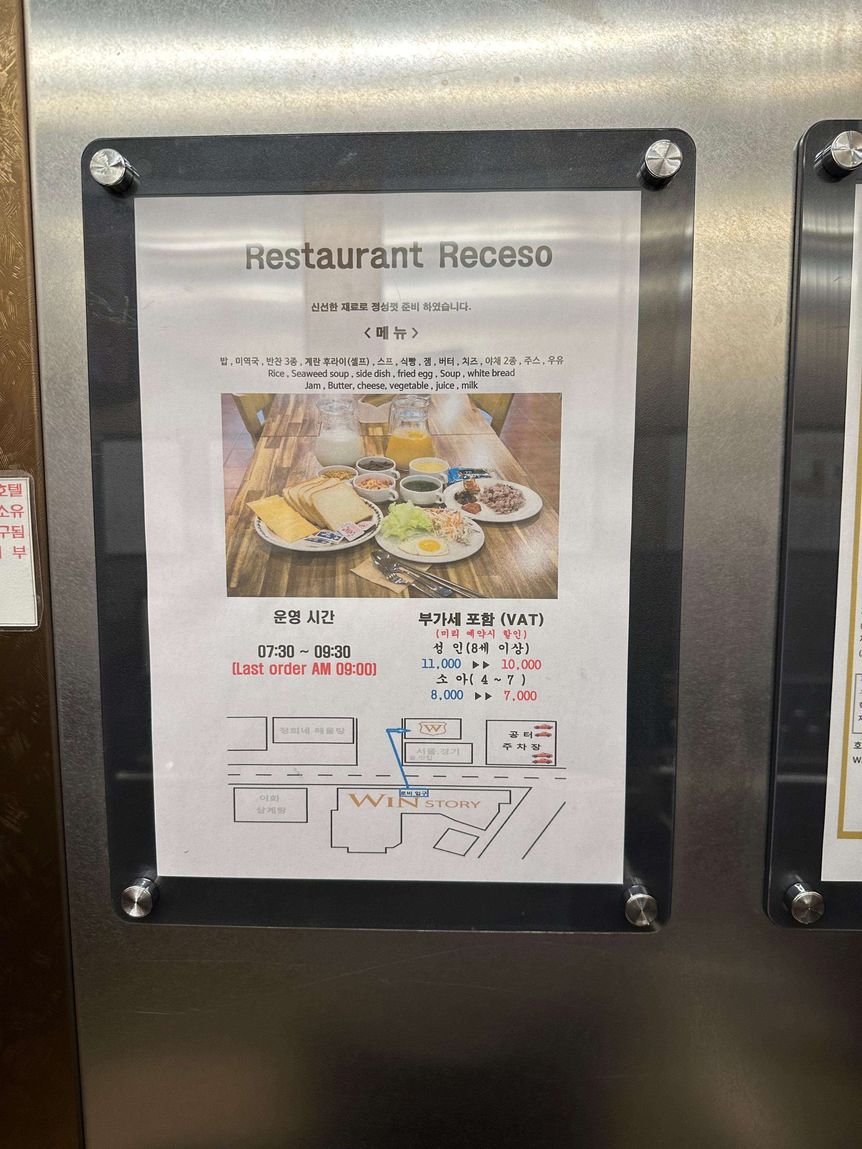 - 조식당은 윈스토리 호텔 정문 맞은편에서 조금 걸어가면 윈스토리 레세소라는 건물에서 운영중입니다.