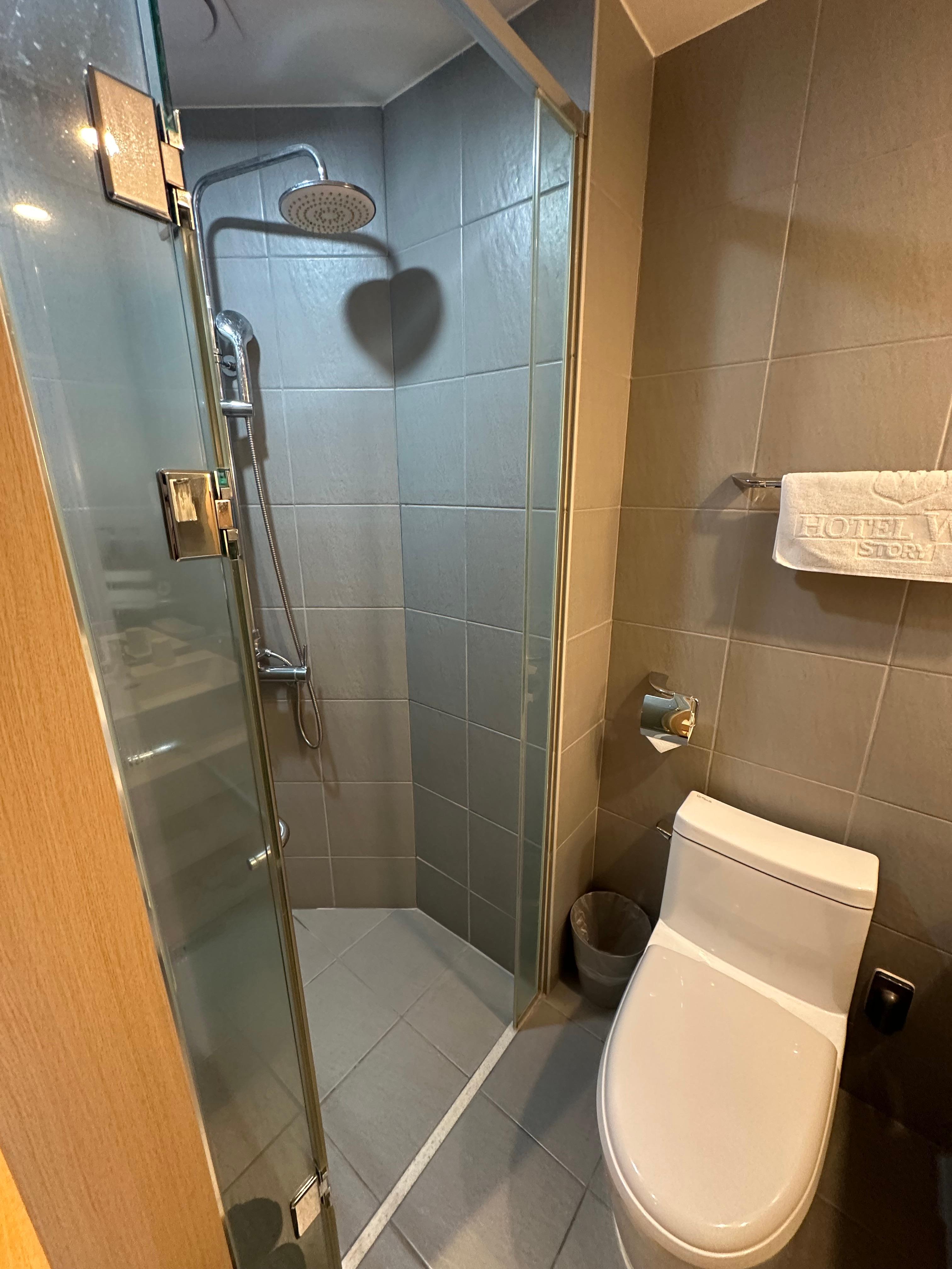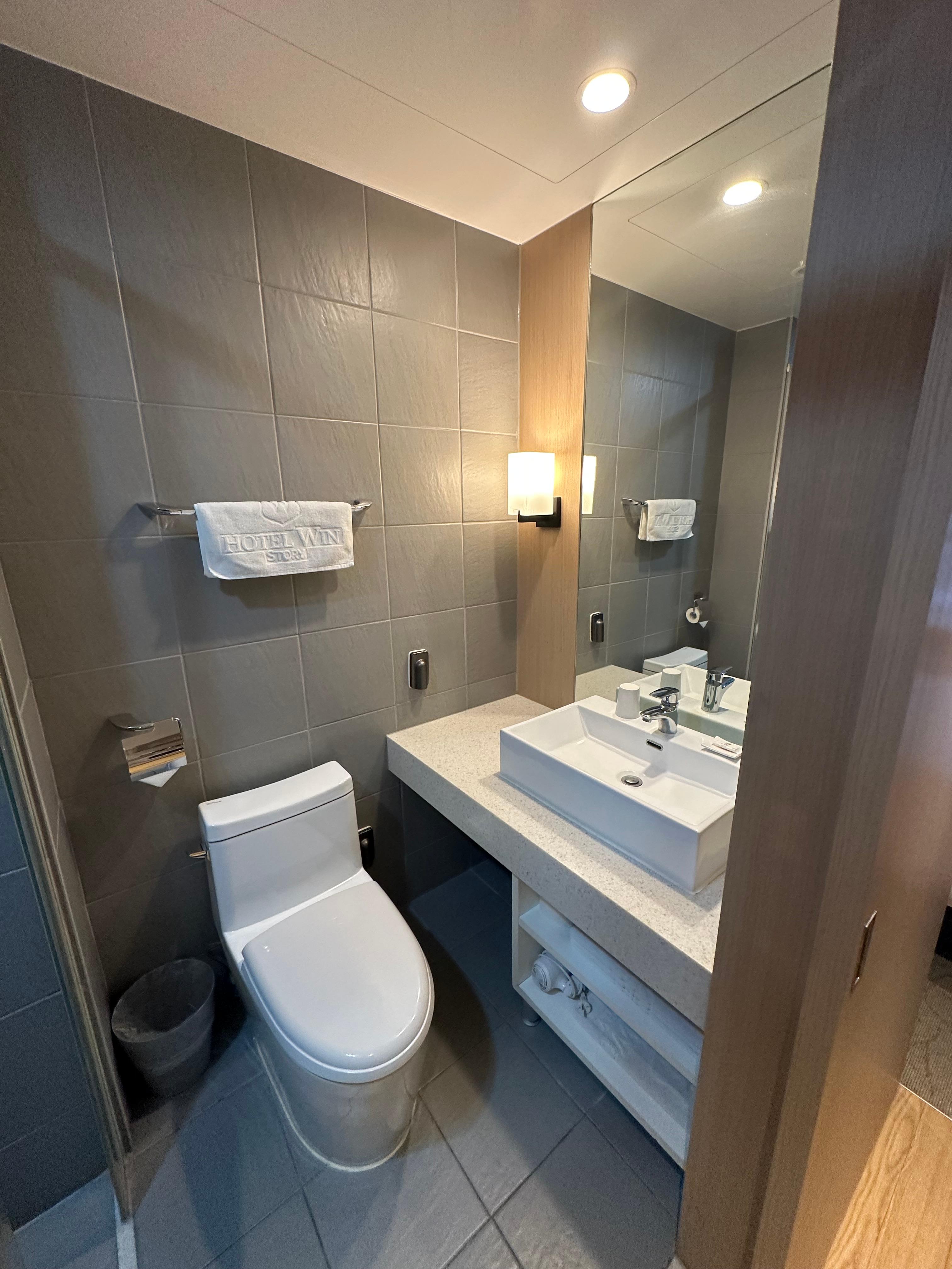 화장실과 세면대는 한공간에 있지만 세면공간은 유리벽으로 구분되어서 세면공간에 물이 닿지 않도록 구조가 되어있습니다. 그 외에 1회용 비누, 수건 여러개가 지급되고 있습니다. 환경 문제로 인해 일회용품은 지급되지 않으며 필요시 프론트에서 개별 구매가 가능합니다. 비대는 없고, 여분의 휴지가 세면대 아래에 지급되어있는 것을 볼 수 있습니다.