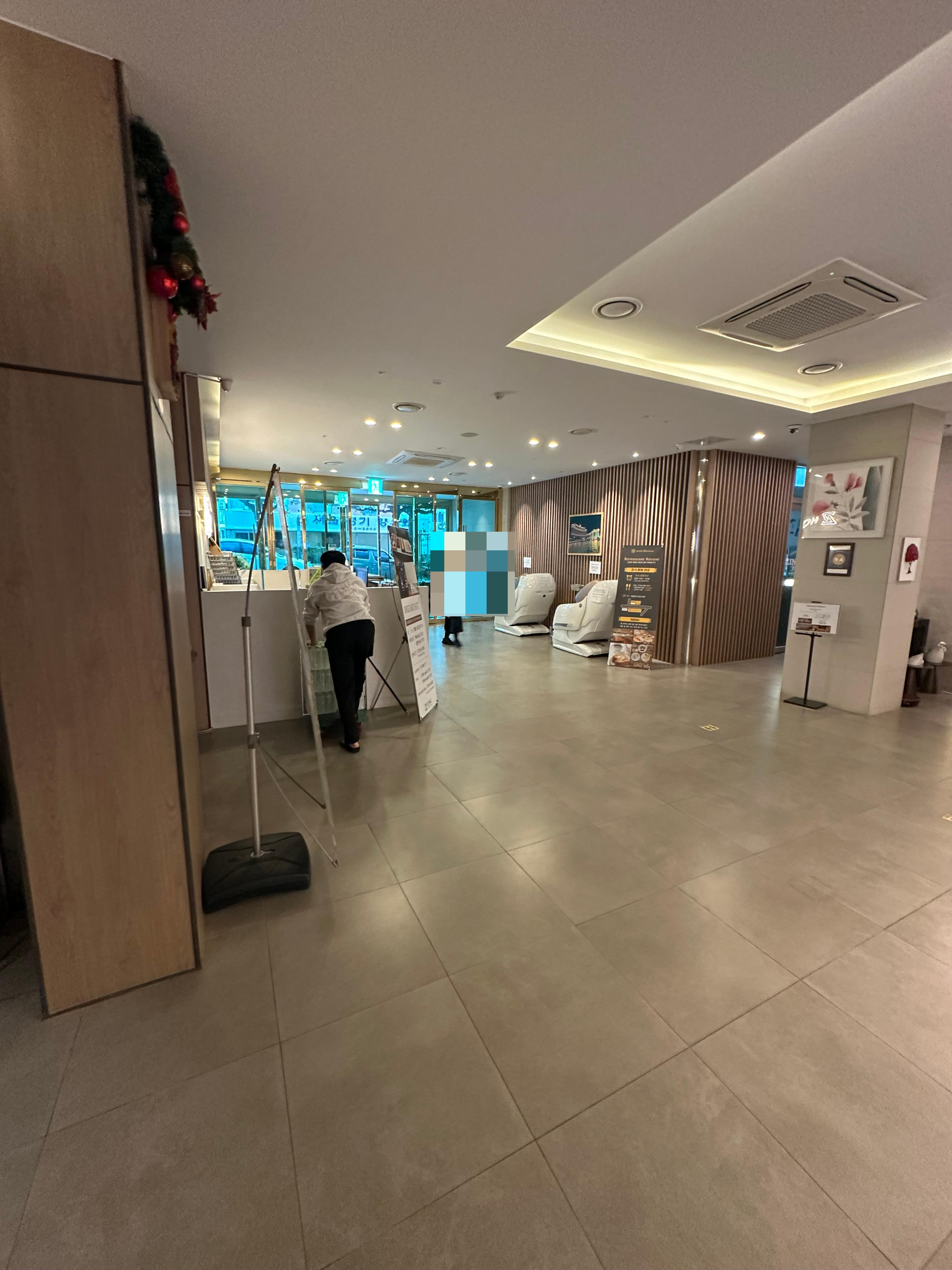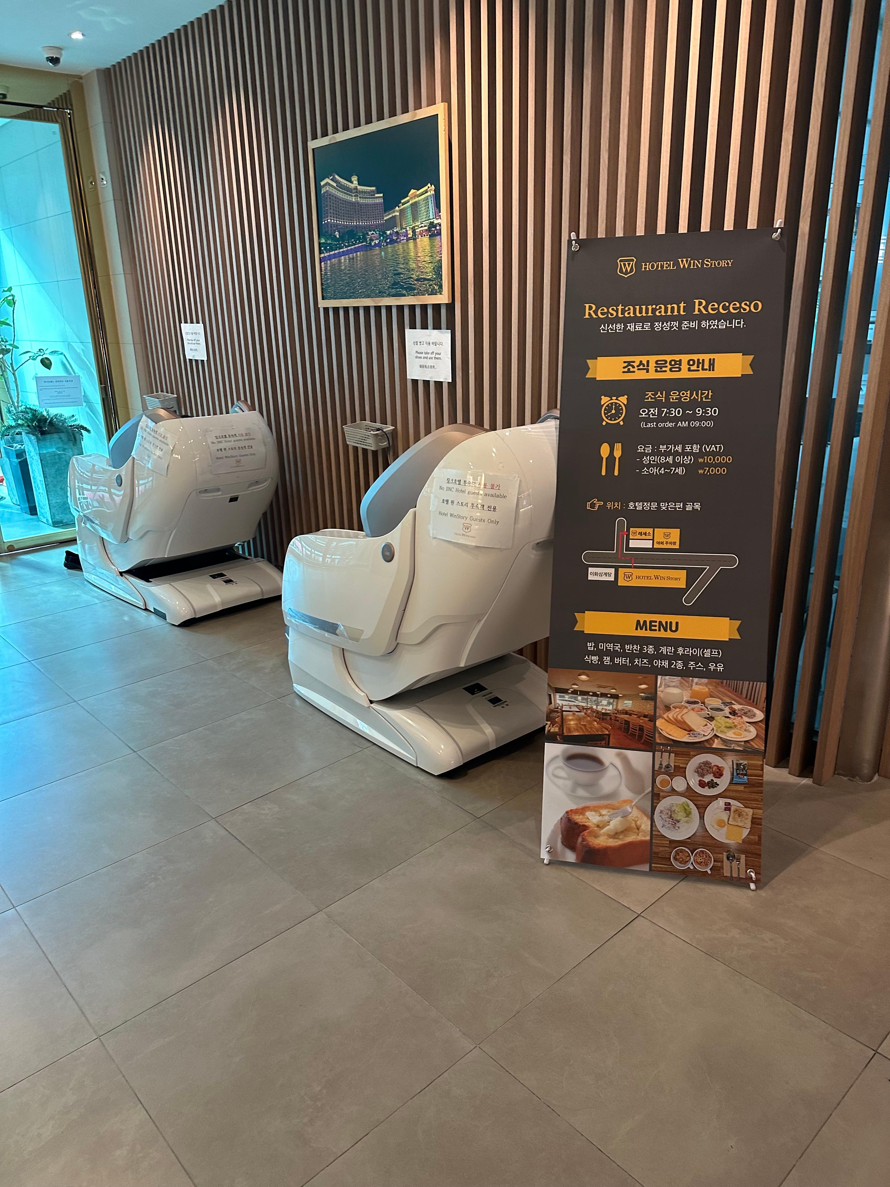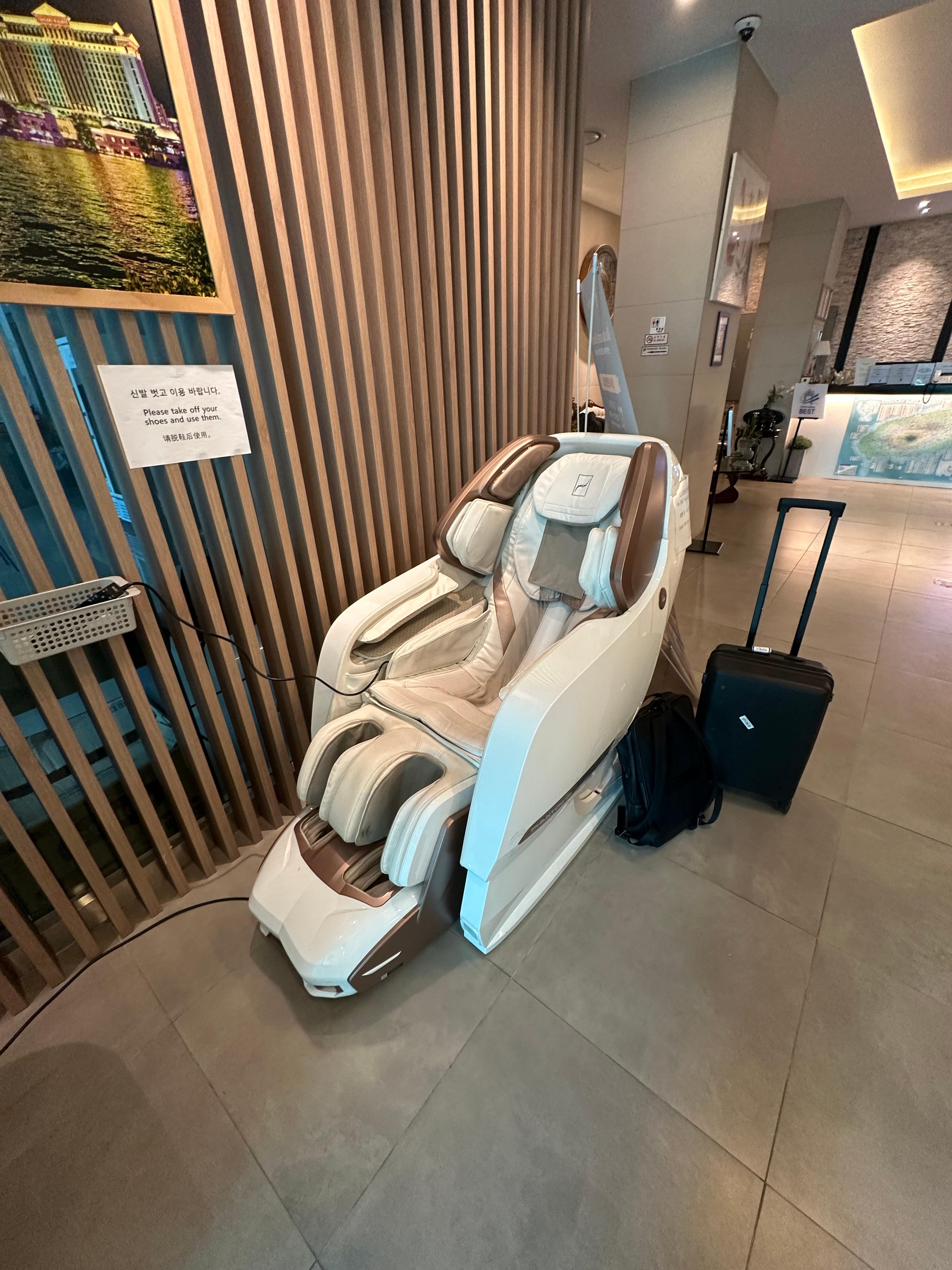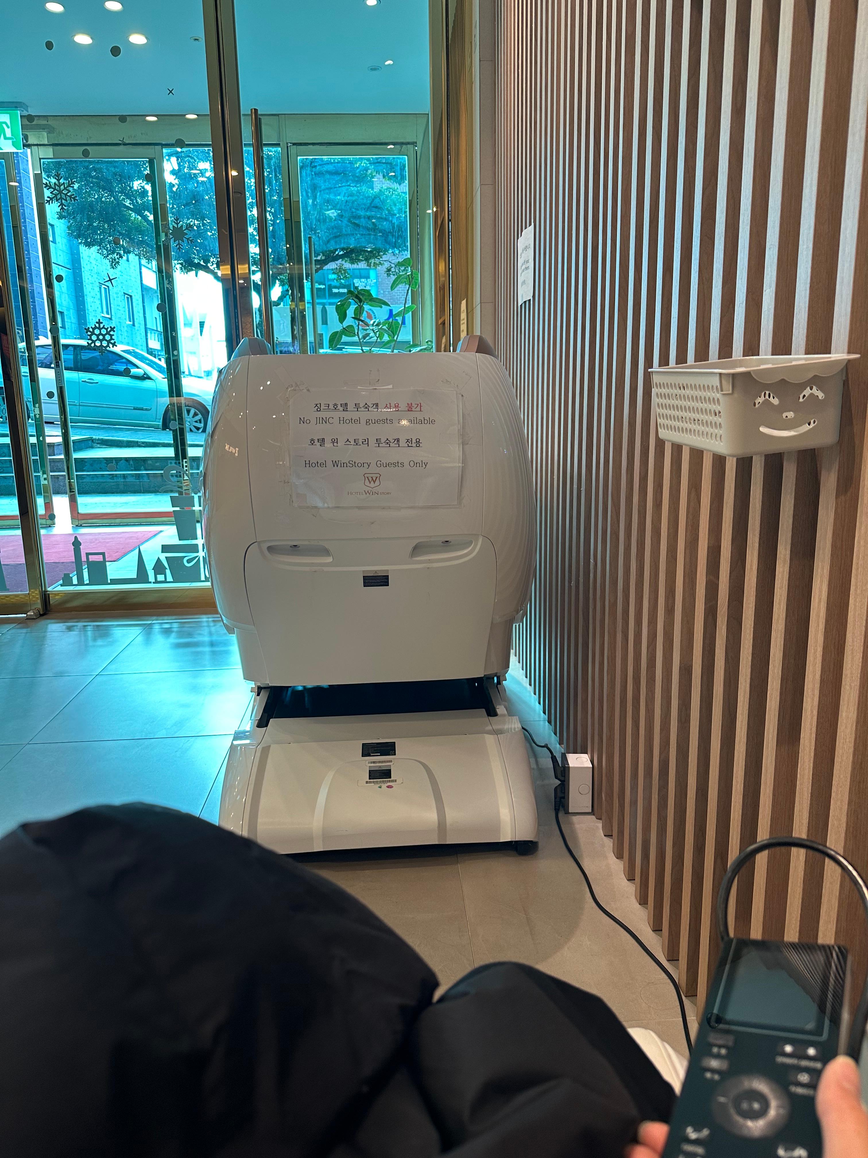 서귀포 윈스토리호텔은 정크호텔과 함께 운영되는데요. 윈스토리 호텔 입구 앞에는 정그호텔 프론트가 함께 운영되고 있었습니다. 2020년에 처음 방문했을 때는 윈스토리호텔만 있다가 코로나 끝날쯤부터인가 정그호텔과 함께 운영되고 있었습니다. 윈스토리 호텔 앞에는 안마기가 2대 있었는데요. 윈스토리호텔 투숙객만 이용할 수 있고 정크호텔은 이용할 수 없었습니다. 항상 이용하지 못했는데요. 이번에는 숙박하면서 무려 두번이나 이용했습니다. 윈스토리 프론트에서 체크인을 마치고 저는 객실로 이동했습니다.