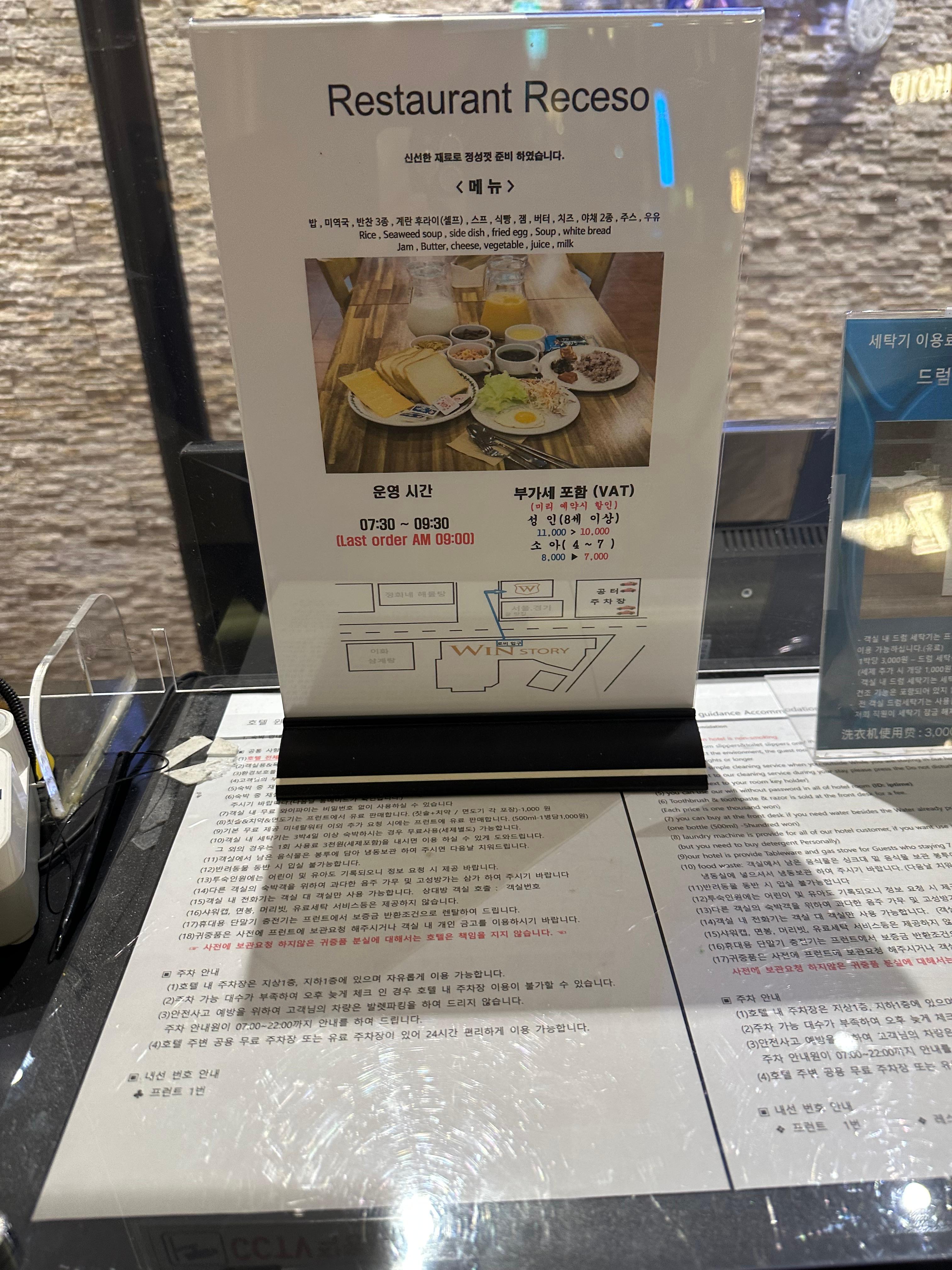 객실에서 조금 쉬다가 저는 세탁기 세재와 조식권을 구매하기 위해 1층 프론트로 갔는데요. 세탁기 세제 구매하니까 세탁기 이용하는 방법도 이렇게 안내하고 있었습니다. 지난 2023년 8월에는 성수기가 지난 평일이라 그런지 이용하는 투숙객이 많이 없어서 조식당을 운영하지 않아 아쉬웠는데요. 하지만 이번에는 조식당을 운영하고 있었습니다. 조식당은 당시 2024년 12월 기준으로 10,000원에 이용할 수 있었습니다. 원래는 윈스토리 호텔 조식당은 호텔 1층에 있었는데요. 이번 방문에는 호텔 맞은편 건물로 옮겨졌습니다.