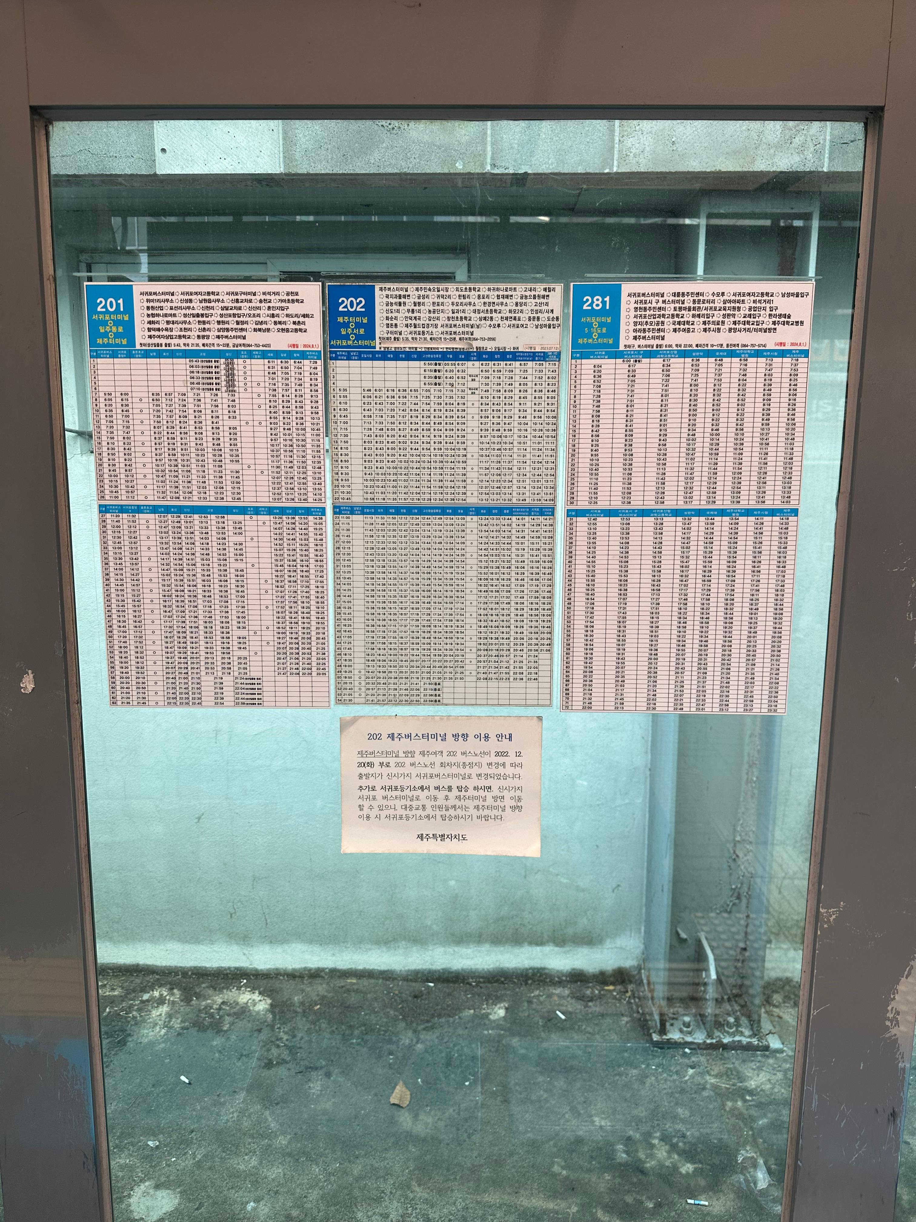 지금의 서귀포 버스터미널은 서귀포제2청사가 있는 이마트에 있었습니다. 서귀포 구 터미널에는 201번과 202번, 281번 버스가 다니고 있습니다. 제주버스터미널에서 출발해서 동쪽과 서쪽으로 해서 운행하는 각 동일주 서일주 버스노선이 여기서 다시 만나는 것 같습니다. 자주 다니는 버스라 그런지 시간표도 정말 긴 것을 볼 수 있습니다.