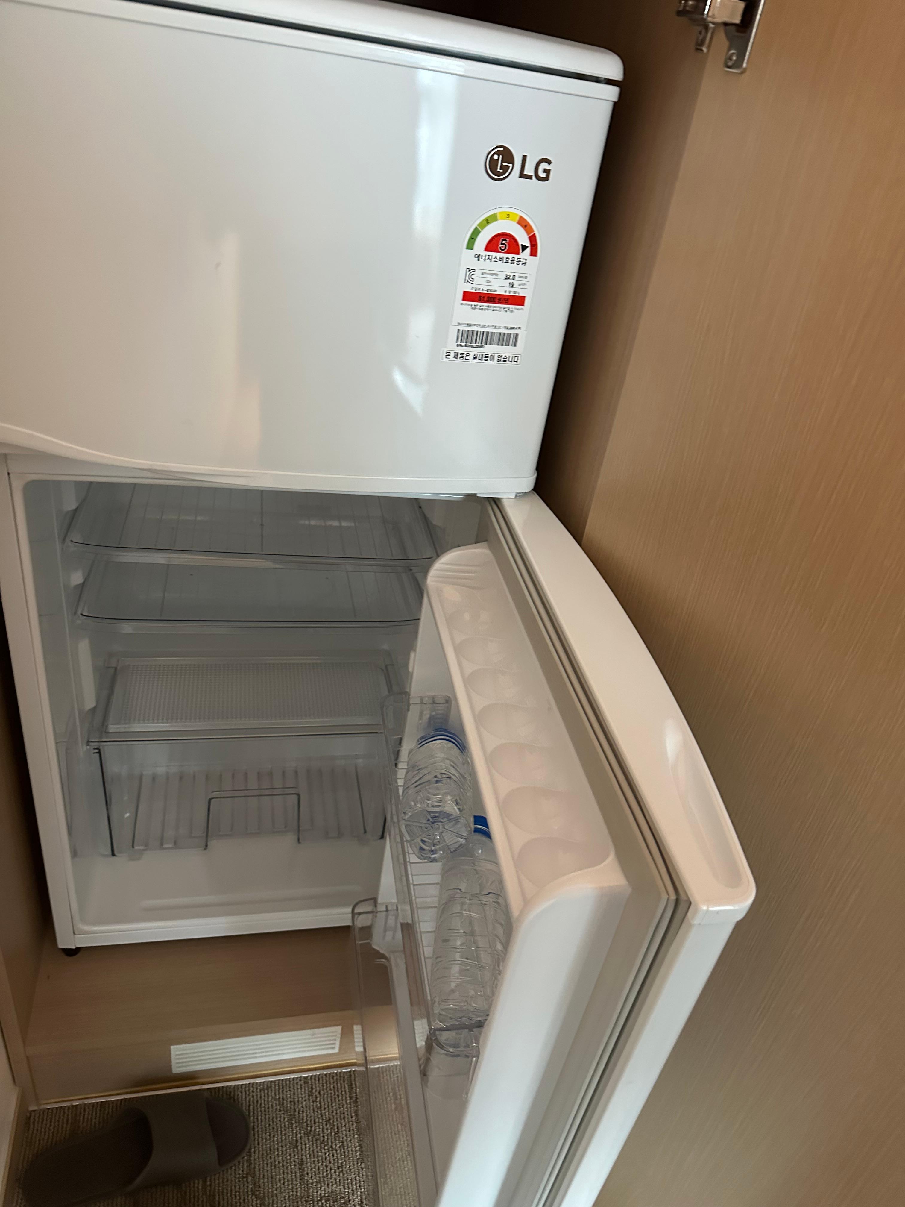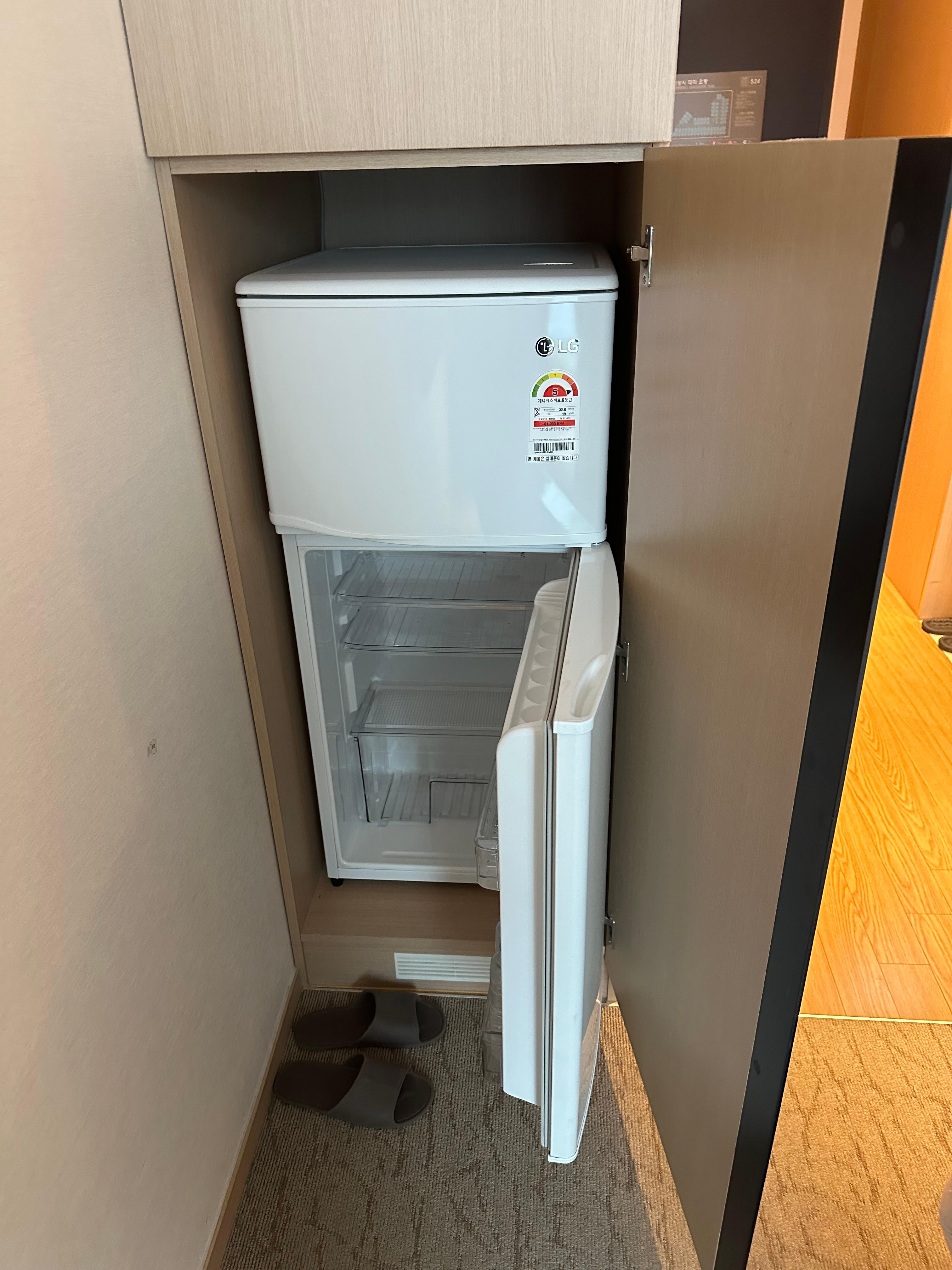 객실마다 조금 다르긴 한것 같은데요. 냉장고가 있던 윈스토리호텔 객실이었는데요. 냉장고가 바로 보이지 않고 서랍 안에 있었습니다. 처음에는 냉장고가 보이지 않아서 당황했는데요. 창문 반대편에 보니까 가구가 있었고 가구 문을 여니까 냉장고가 보였습니다. 냉장고는 비교적 큰 편이었는데요. 보통 숙소의 경우 작은 냉장고였는데요. 윈스토리호텔 객실냉장고는 냉장고와 냉동실이 있는 조금 큰 냉장고였습니다. 그래서 혼자서 이용하기에는 조금 여유롭게 이용할 수 있는 크기였습니다.